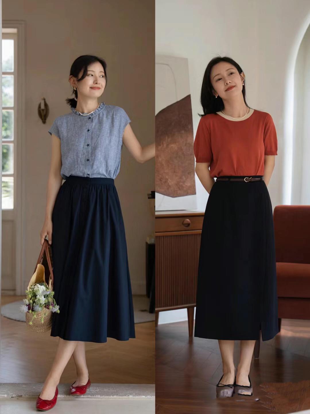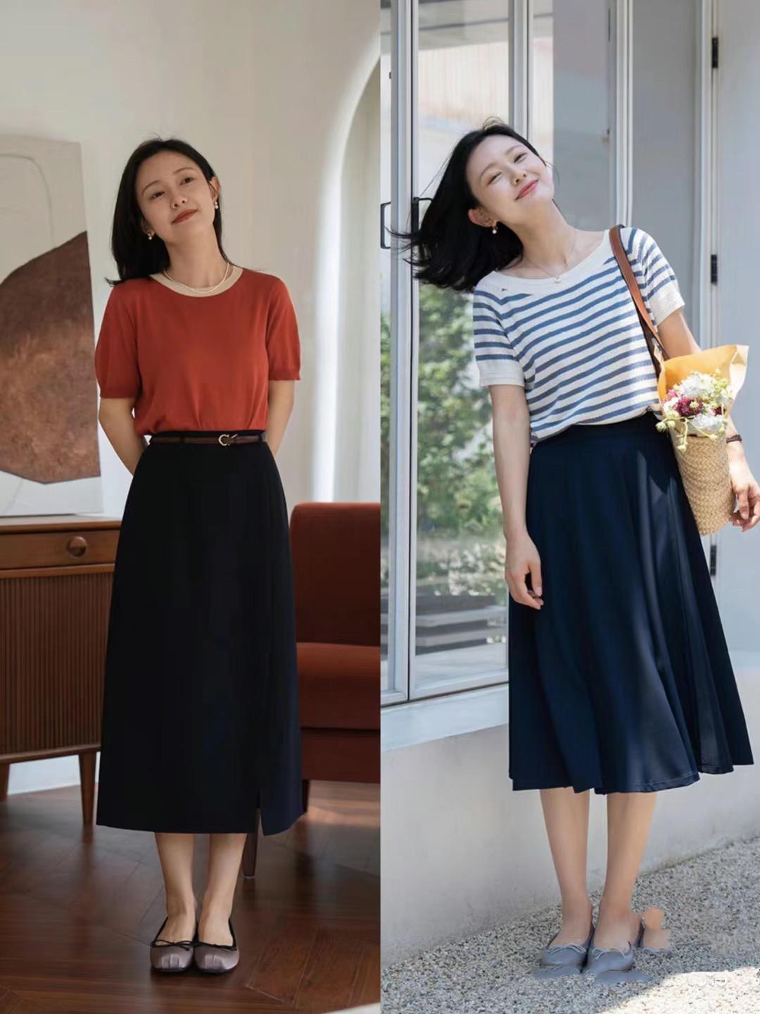 比如棉麻成分的半身裙,不僅舒適透氣、也相對挺闊。帶有筋骨感的半身裙,可以配柔軟細膩的冰絲短衫,面料上的對比也更提氣質。
