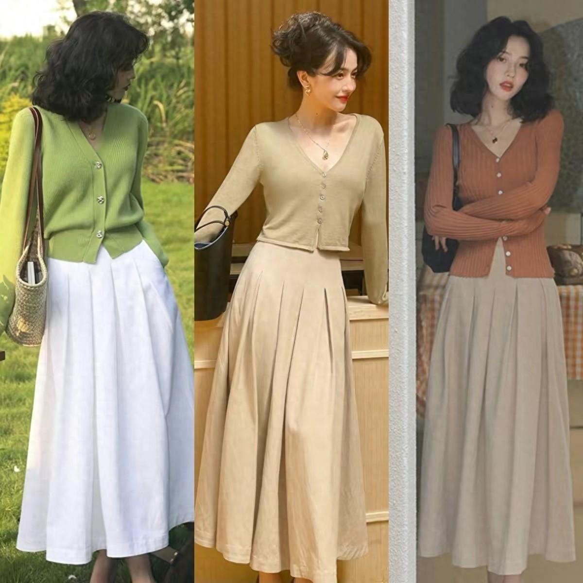 短衫+赫本裙的搭配,是一種上短下長、上緊下松的組合方式,如果我們配一雙尖頭的高跟鞋、或者淺口的小皮鞋,精緻感也會更強一些。