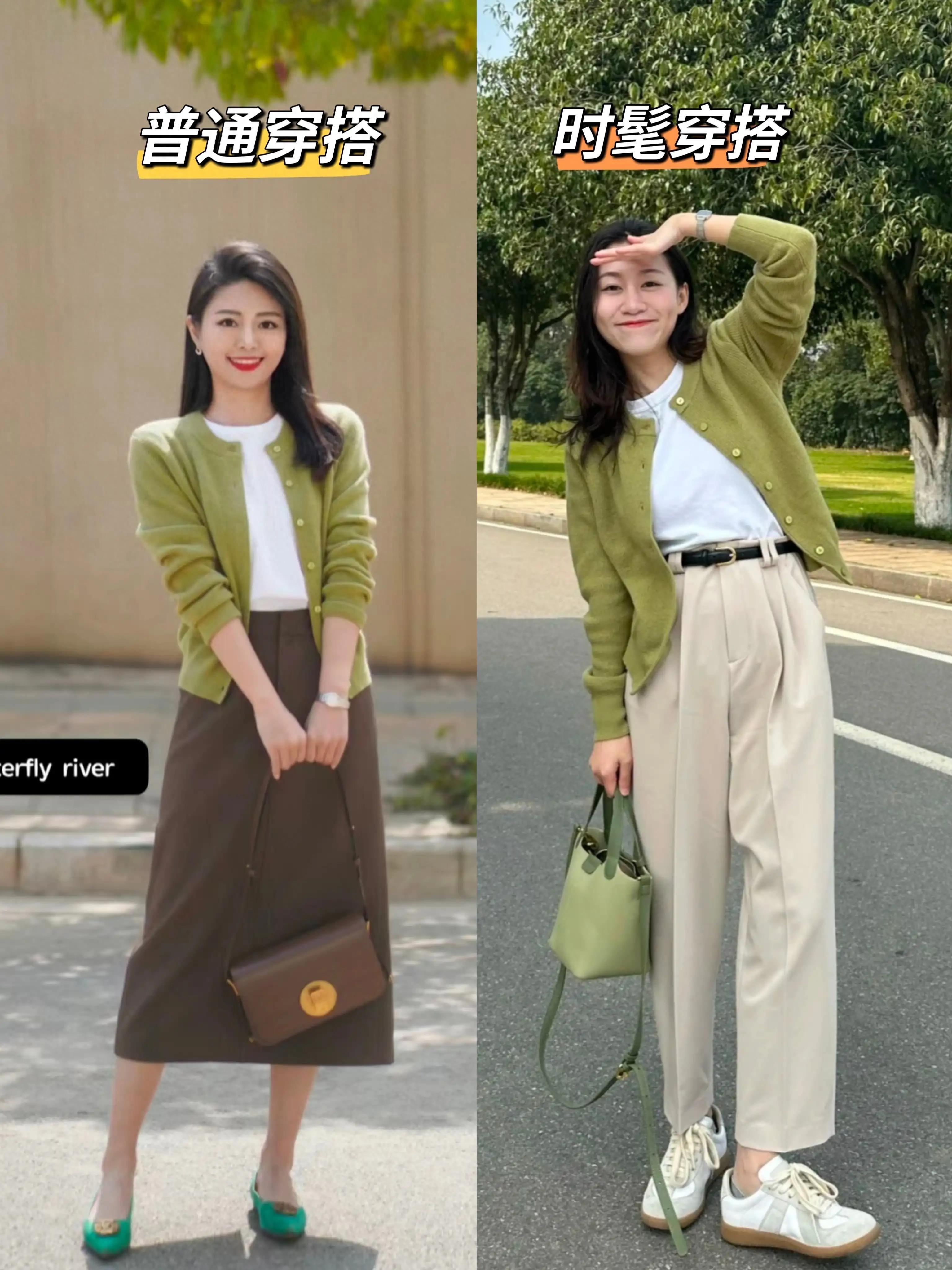 同樣是軍綠色的針織衫疊搭白色T恤,普通穿搭分明是有些保守了,中規中矩了少了情調感。而時髦穿搭則運用了腰帶的修飾,德訓鞋的搭配,優化比例的同時增強了鮮活感,更加醒目。