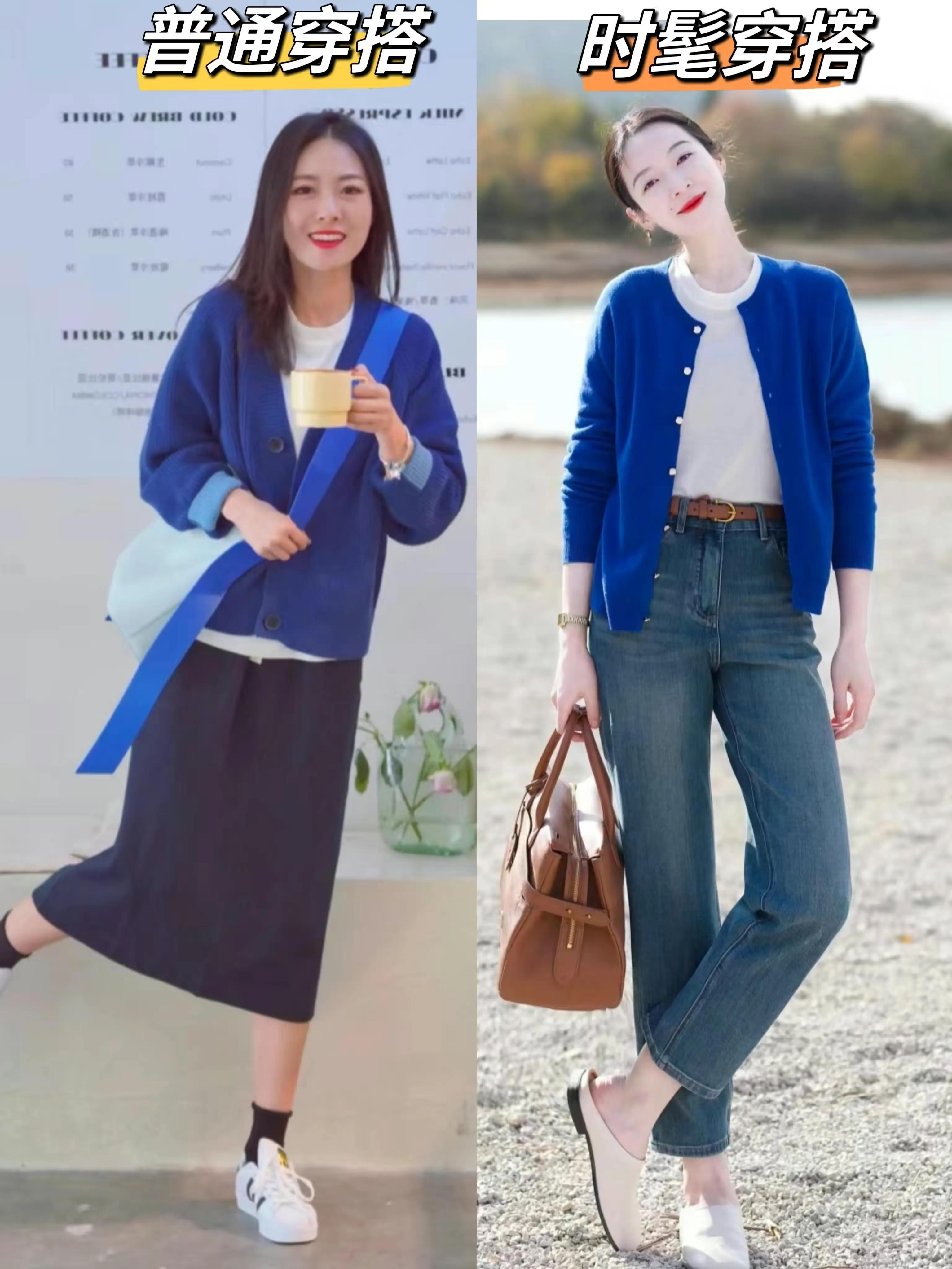 克萊因藍的針織衫,真的是很醒目呀。藍白配色、藍黑配色雖然都同樣高級,但如果不注意比例的呈現,就會顯得拖沓,如左圖的普通穿搭。