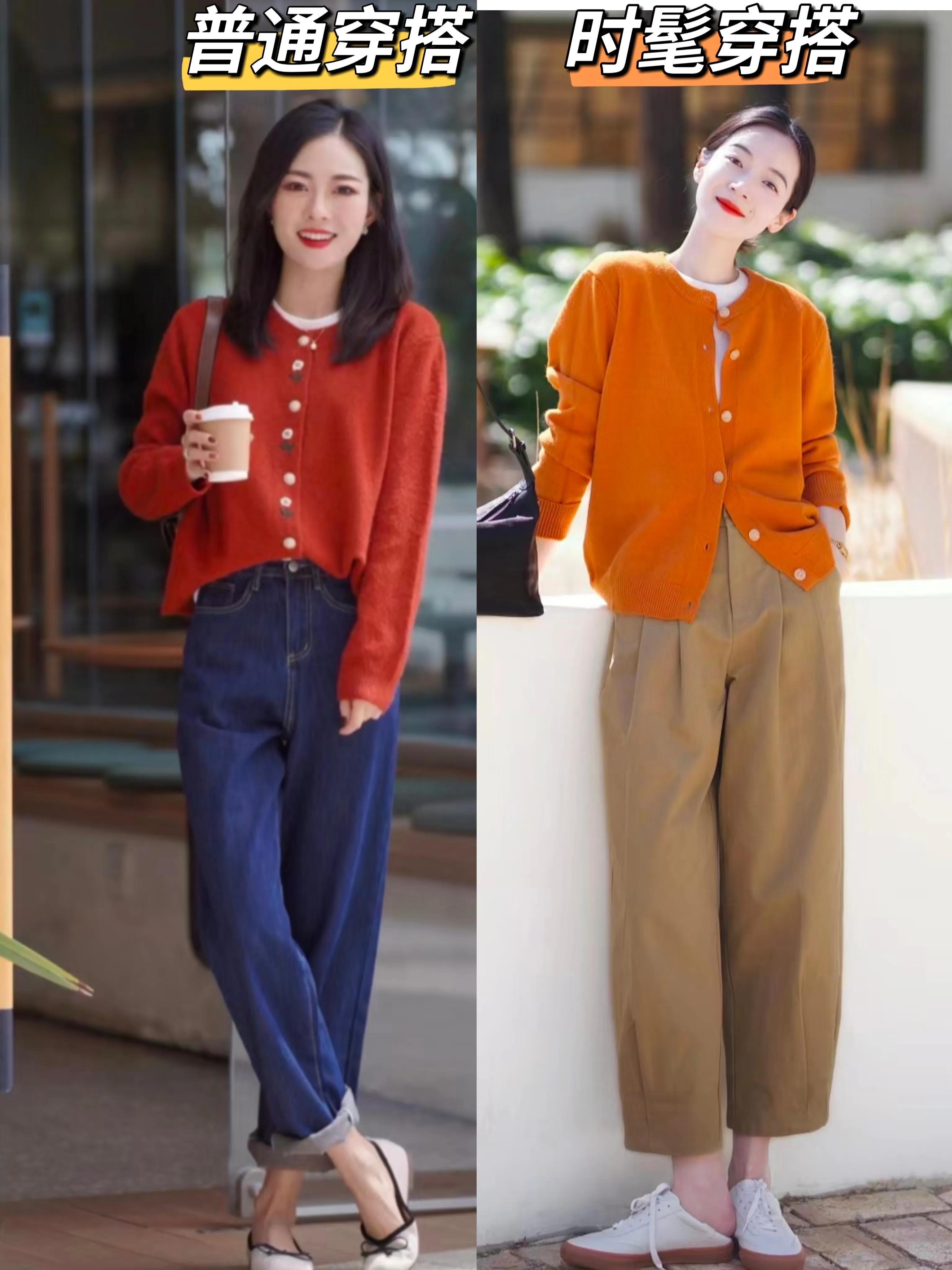橘紅色系的針織開衫,當普通穿搭遇到時髦穿搭,也是高下立見。