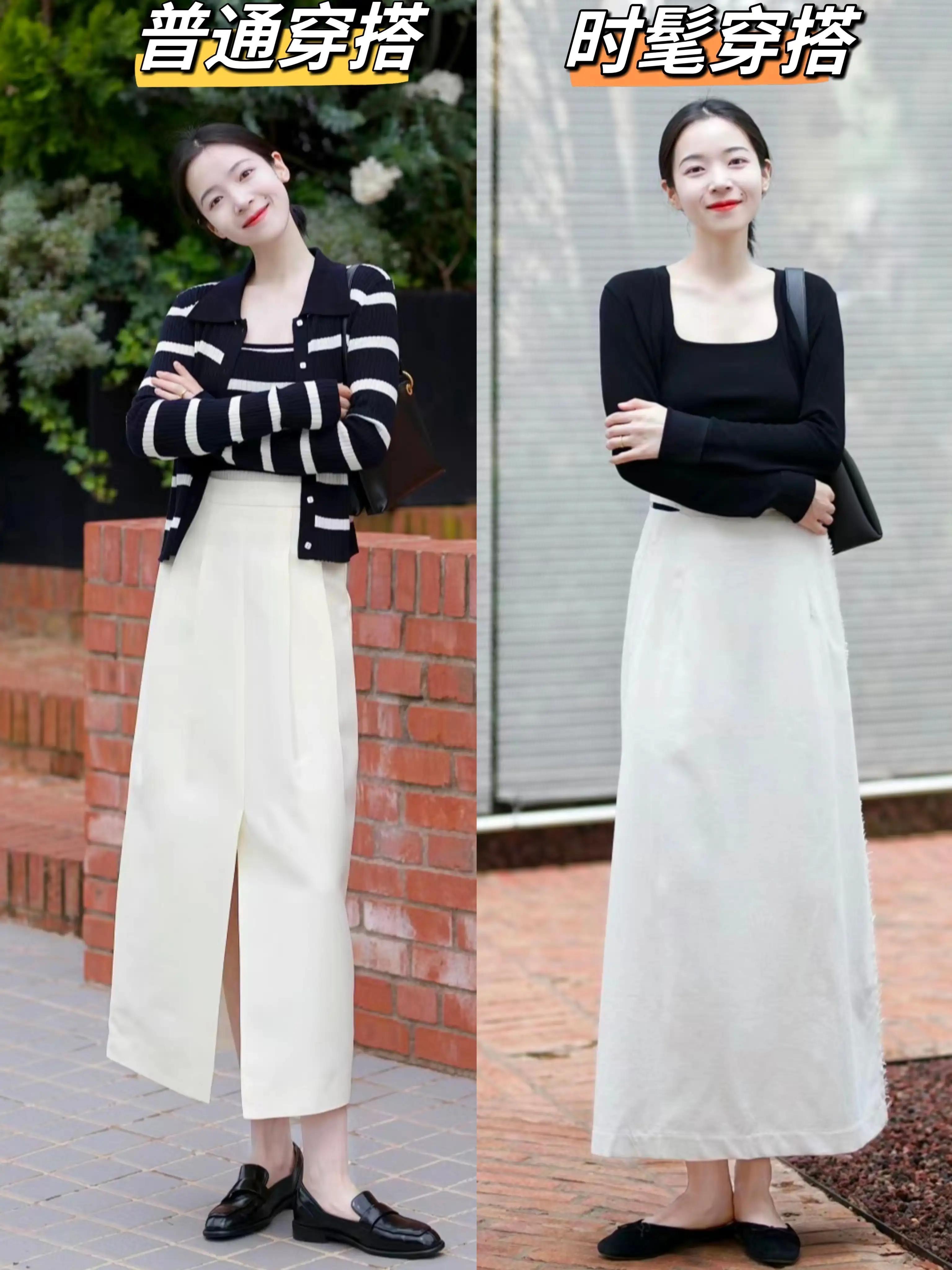 修身的黑色打底衫,方領的設計更加輕盈。用修身打底衫來搭配高腰的A字形半身裙,白色半身裙高腰的款式、流暢的剪裁,抬高腰線又包容身形,配V口的單鞋更輕便洋氣。