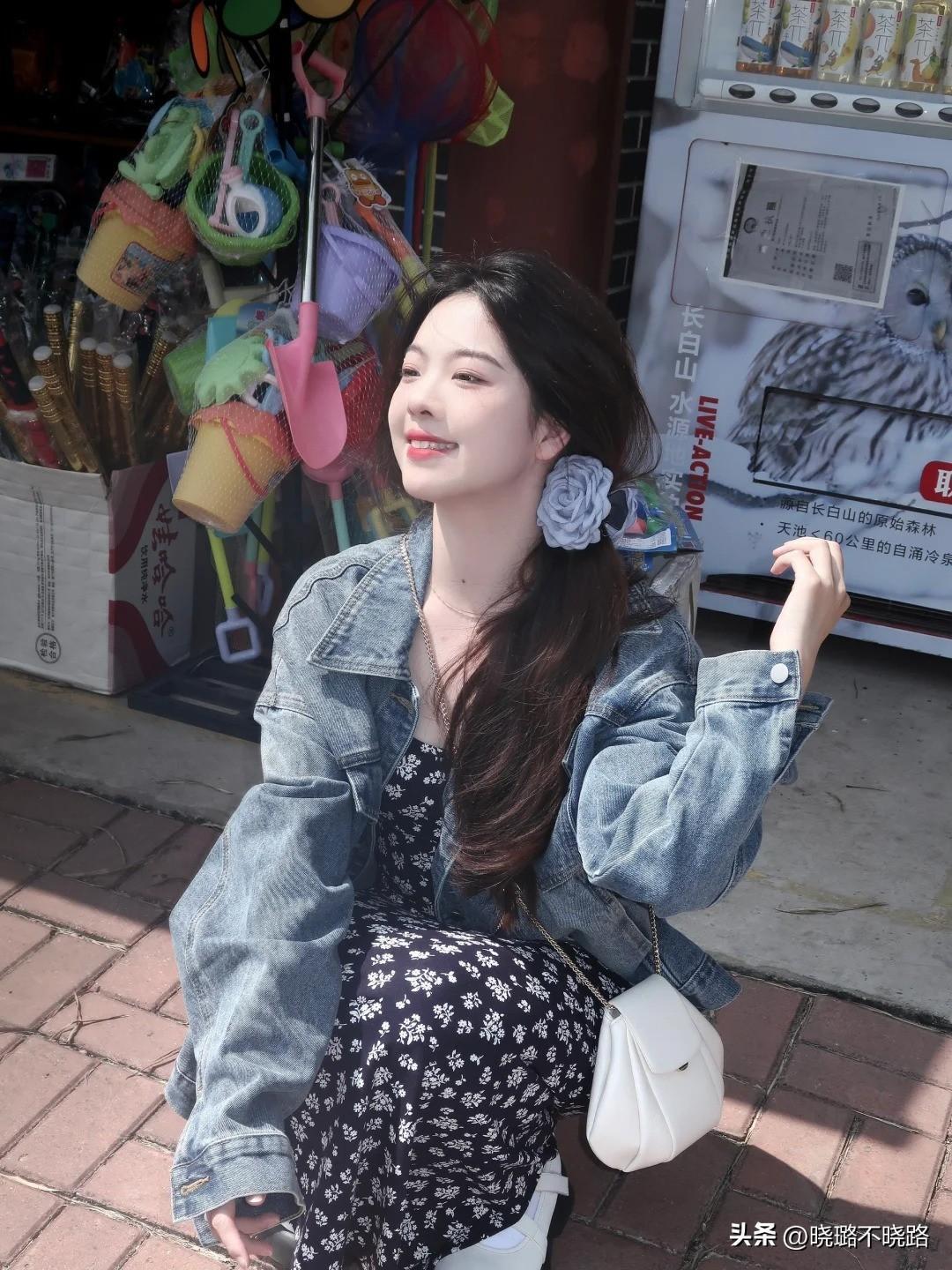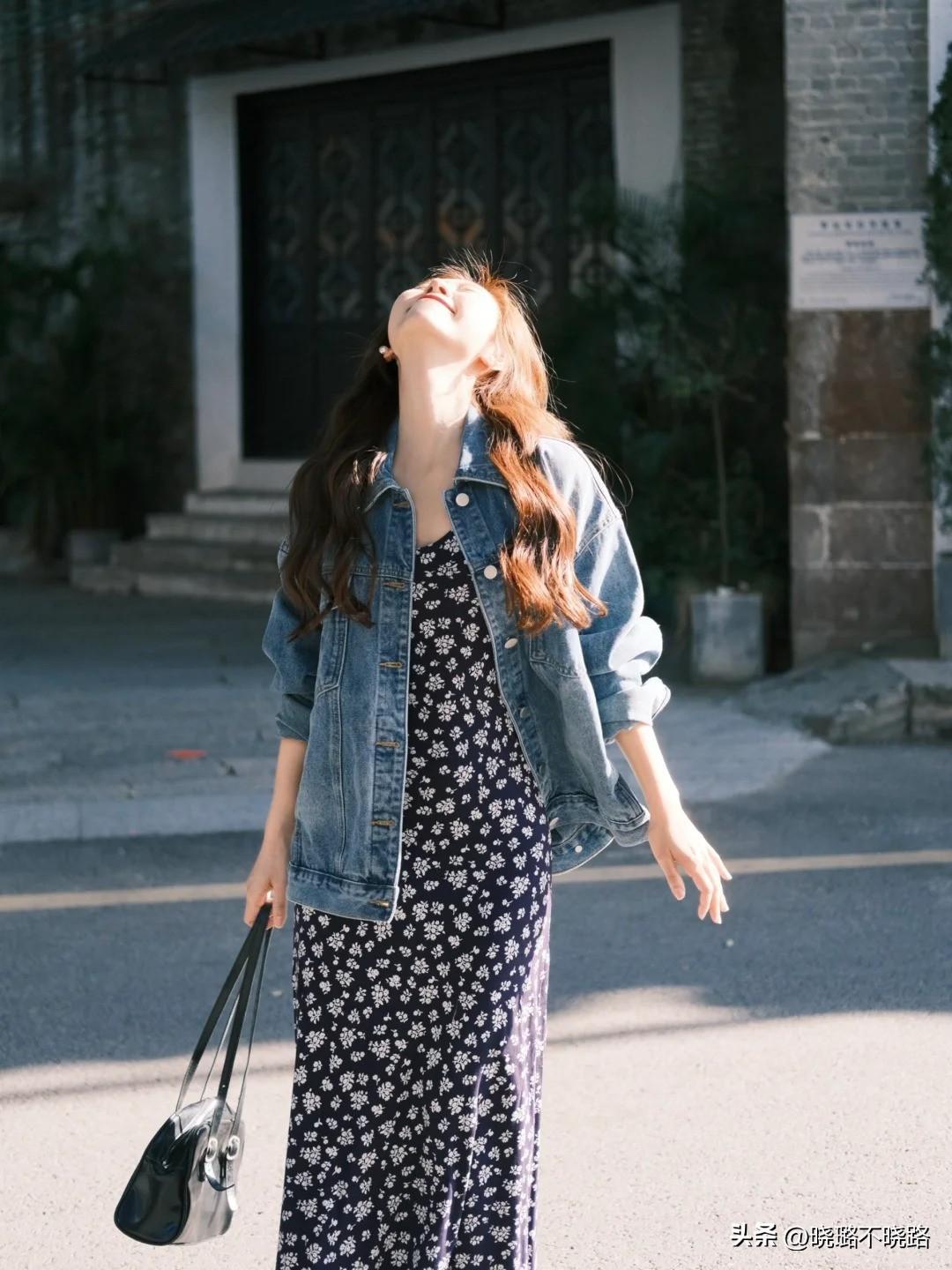 單品組合:藍色牛仔外套+碎花連衣裙