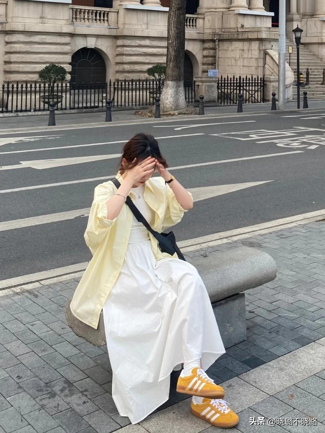 單品組合:奶黃色襯衫外套+白色寬鬆連衣裙