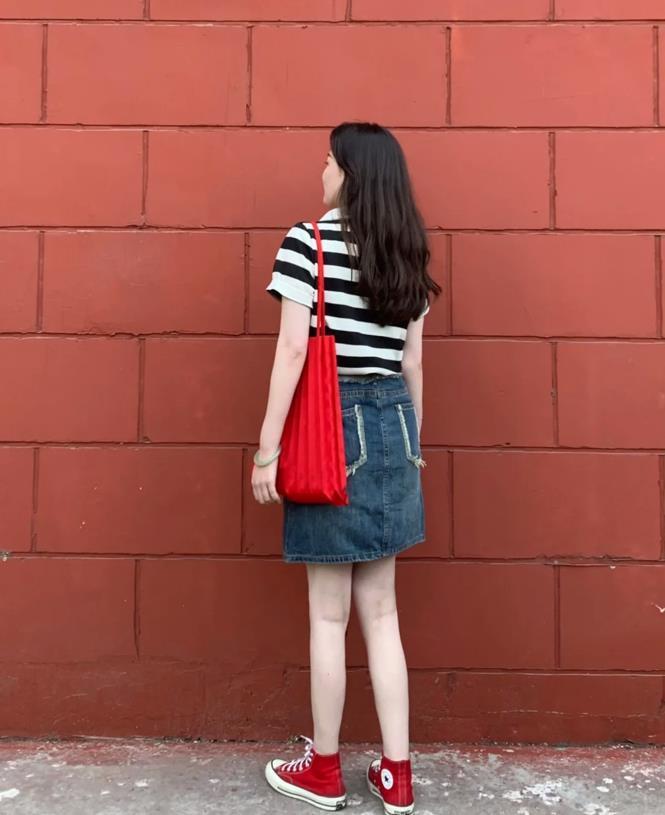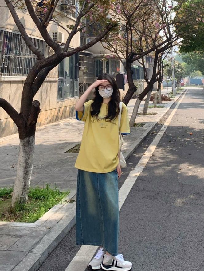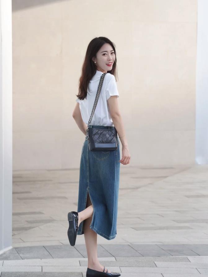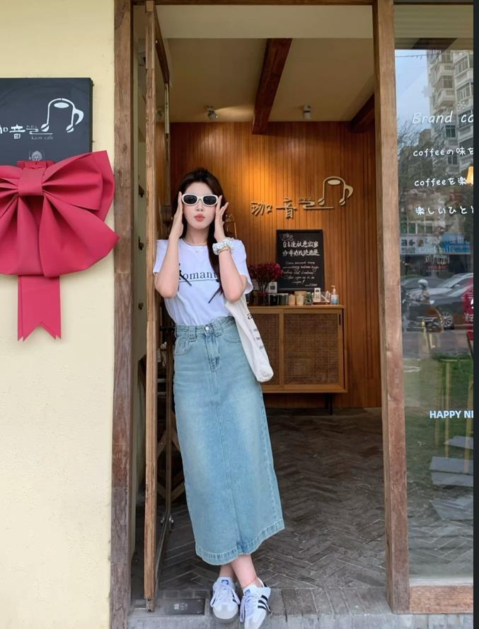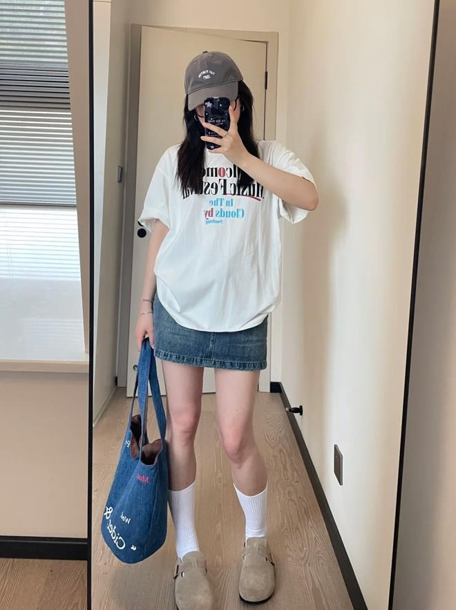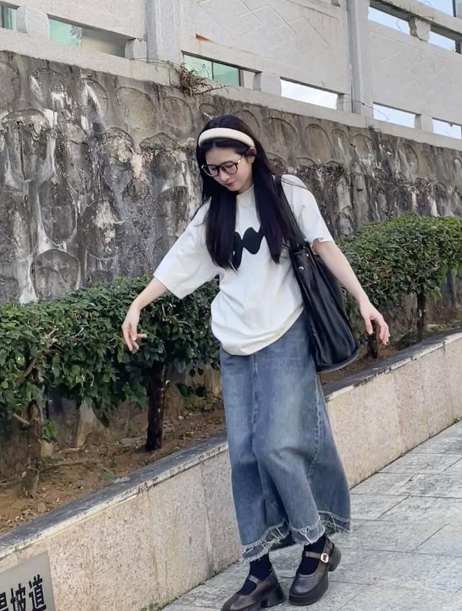 短袖t恤配牛仔半裙,這種穿搭方式可是很顯日常休閒的,它們的組合簡單、舒適又不失時尚感,是深受衆多潮人、博主們喜歡的穿搭。