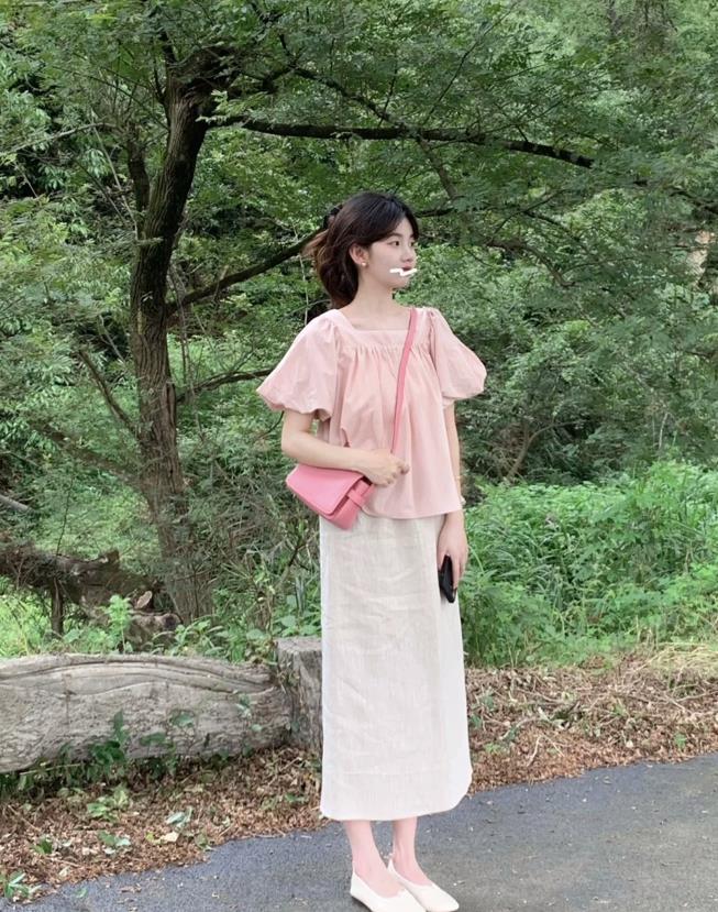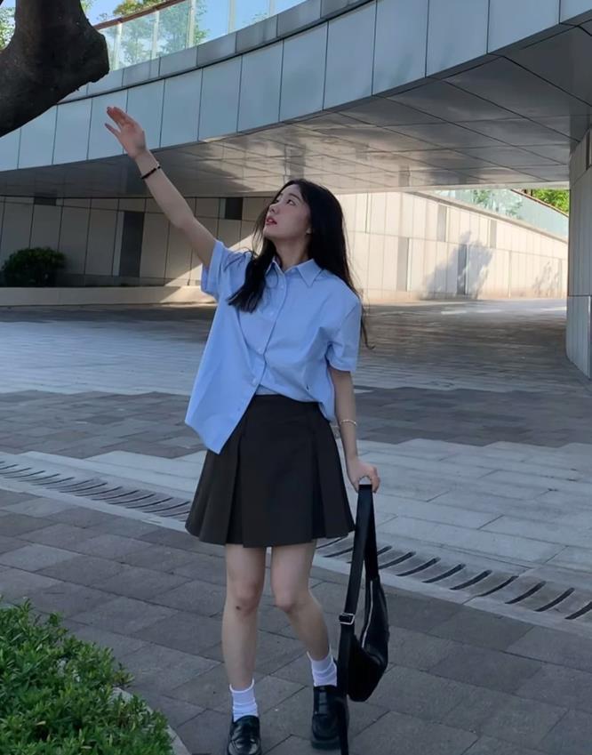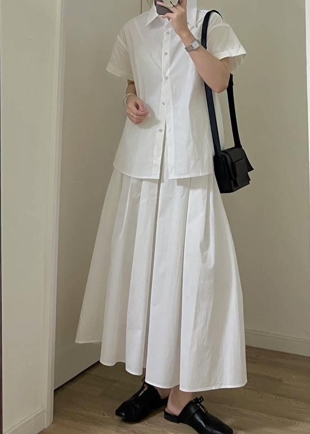 短袖上衣的款式實在是太多了,除了短袖t恤之外,建議你還可以嘗試下短袖襯衫,選擇寬鬆一點的版型,真的可以穿得非常舒適自在,搭配起半身裙,就會很顯時髦氣質了。