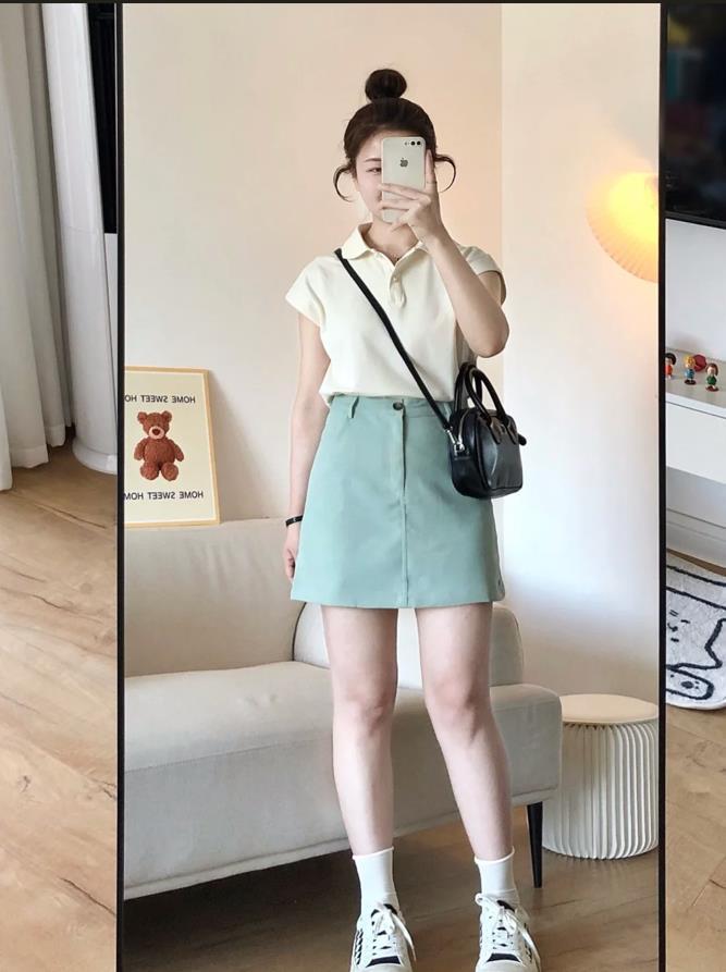 在悶熱的夏季,不妨選擇一件亮色的短袖polo衫,搭配高腰短裙,腳下踩着一雙小白鞋,清新又很減齡,少女風十足。Polo衫的簡約與半身裙的優雅,很好展現出你的優勢,還不失女性的柔美。