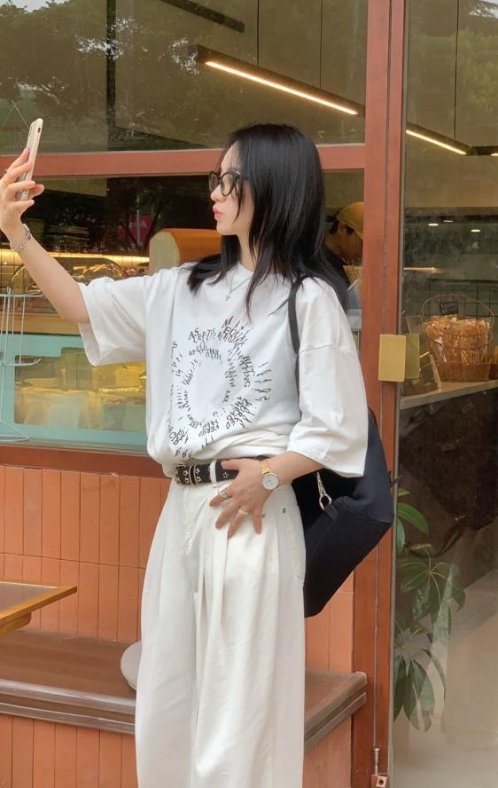 要知道,白色t可是很基礎的單品,具有良好的包容性,無論你是什麼身材,只要選對版型,就可以穿得舒適自在。當然,你也可以嘗試下修身版型的,上半身比例好的姐妹,就大膽選擇修身一些的白t來穿,短款的白t,搭配長款白色褲子,上短下長,能很好優化整個身材比例。