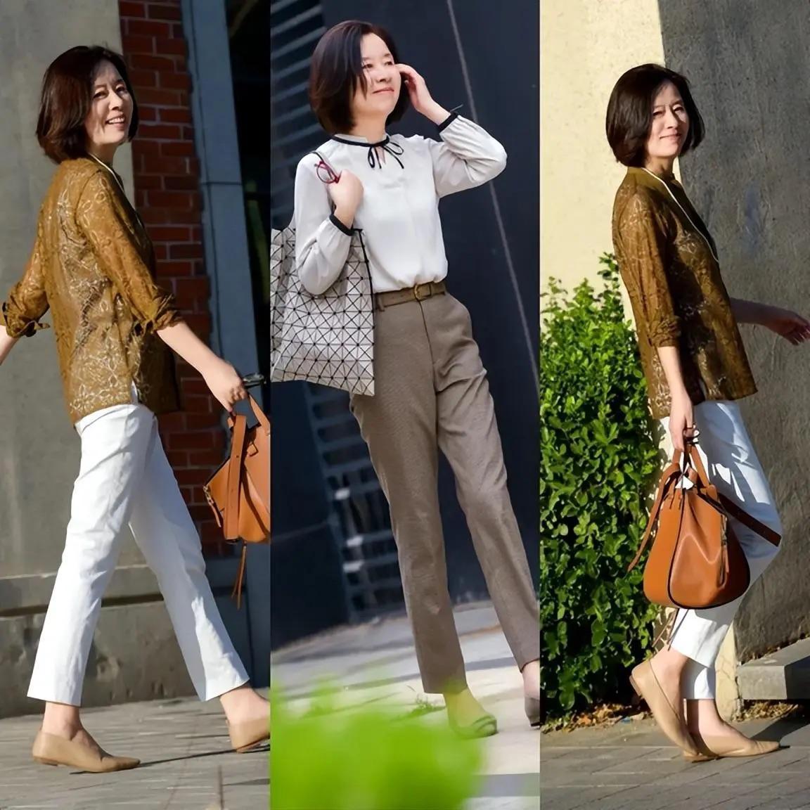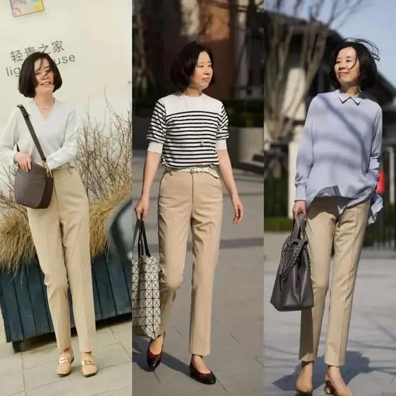 不管是上班通勤、還是日常出街,這種利落輕便的穿搭都是簡約舒適的。奔六的女人,如果擔心腰腹部厚重,可以用九分錐形褲來修飾腿型,剪裁流暢、挺闊大方的錐形褲也很顯瘦。