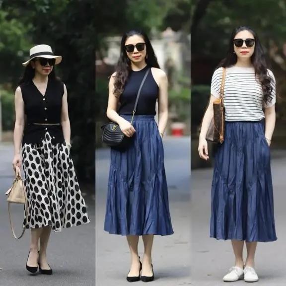 我們可以用針織衫來搭配高腰的A字形半身裙,A字形半身裙以高腰的款式、自然擴張的下襬、大量感的裙襬帶來足夠包容性,穩重優雅、搭誒低跟鞋也很體面顯高。