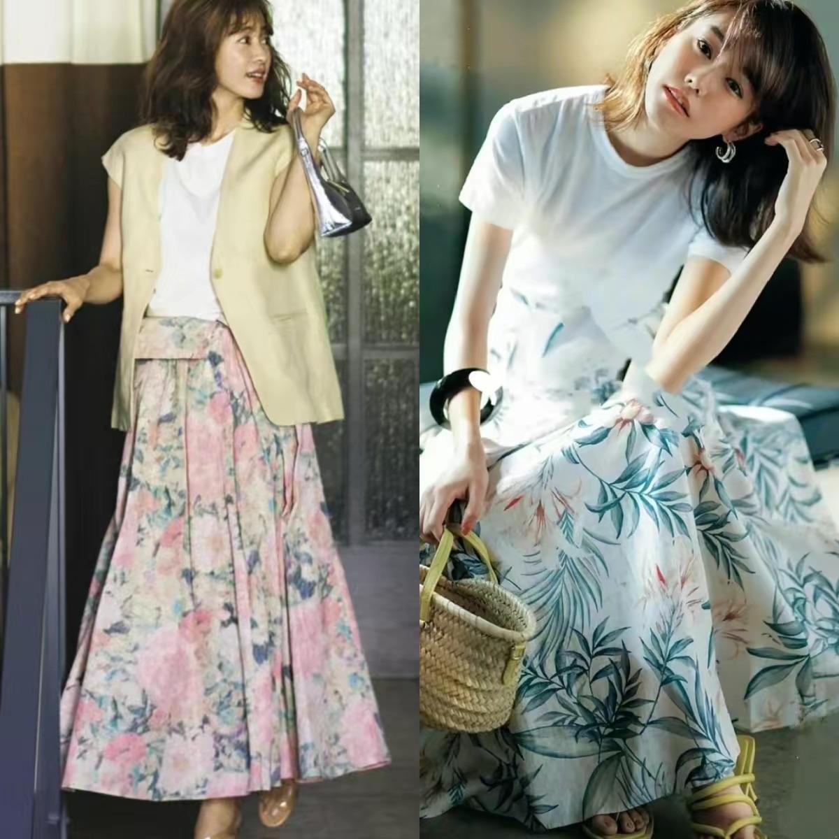 春夏季節的白T恤,想要表現出浪漫柔情,自然是與印花半身裙更爲匹配呀。高腰的印花半身裙,A字形的剪裁、非常的舒適大方。