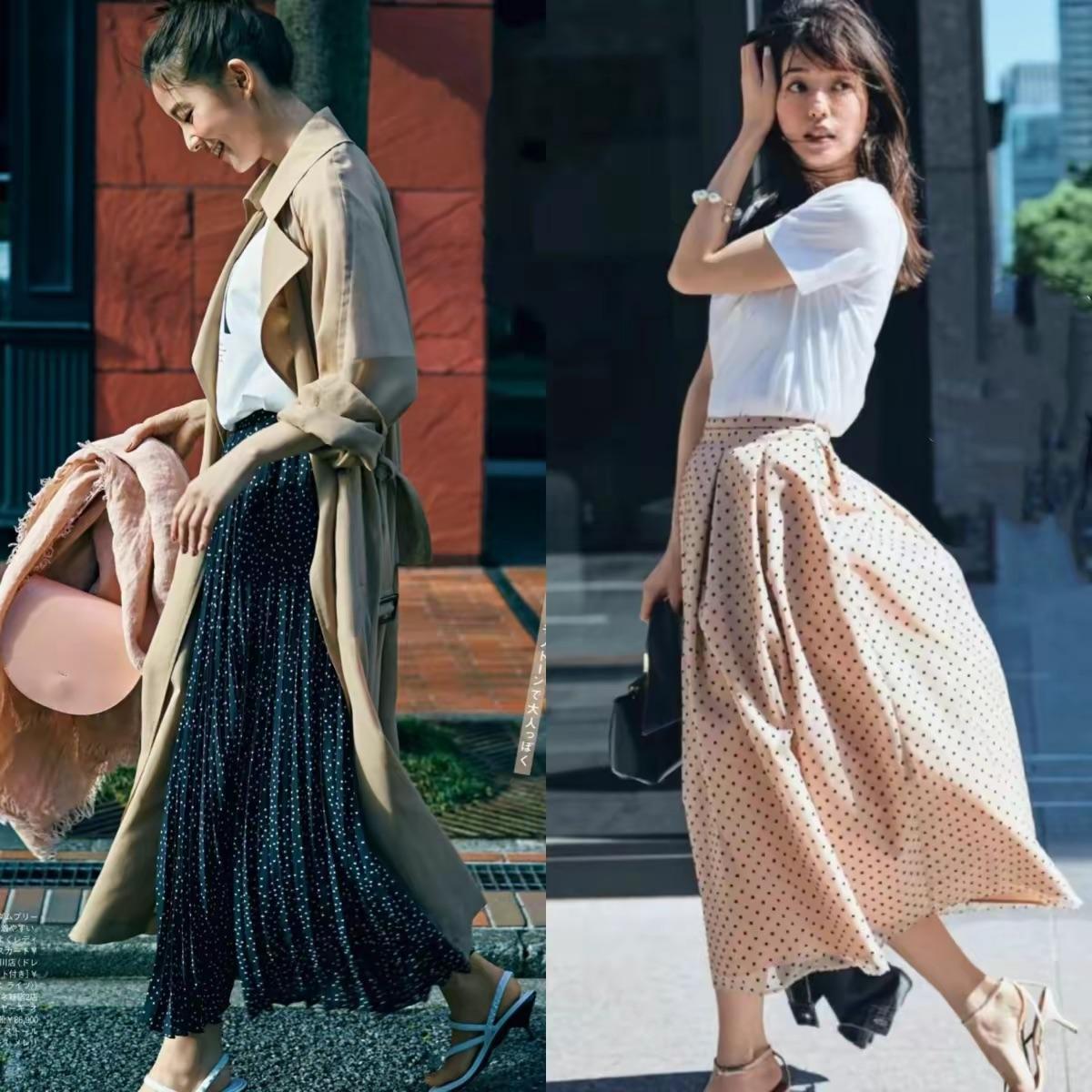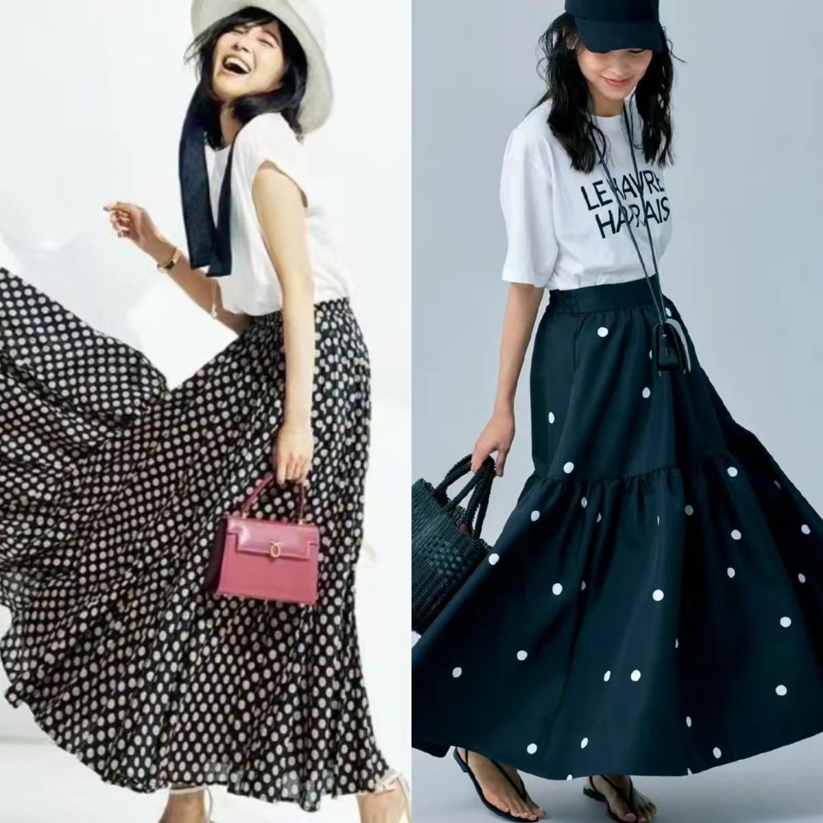 波點的浪漫與靜謐,遇到白T恤的清爽與大方,表現出女性特有的風采。波點半身裙穿起來不浮誇、不單調,可以中和白T恤的乏味,讓春夏穿搭更加時尚。
