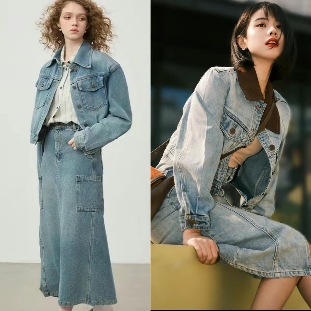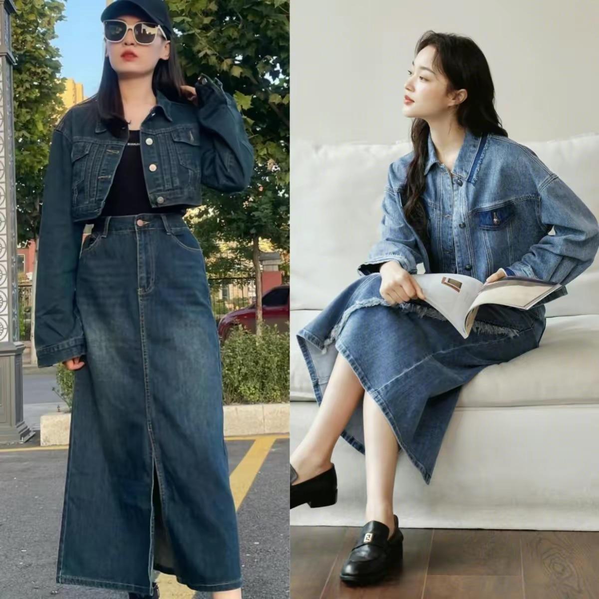 當我們選擇牛仔整套穿的時候,除了選擇牛仔半身裙+牛仔襯衫的搭配,還可以選擇牛仔半身裙+牛仔外套的搭配。