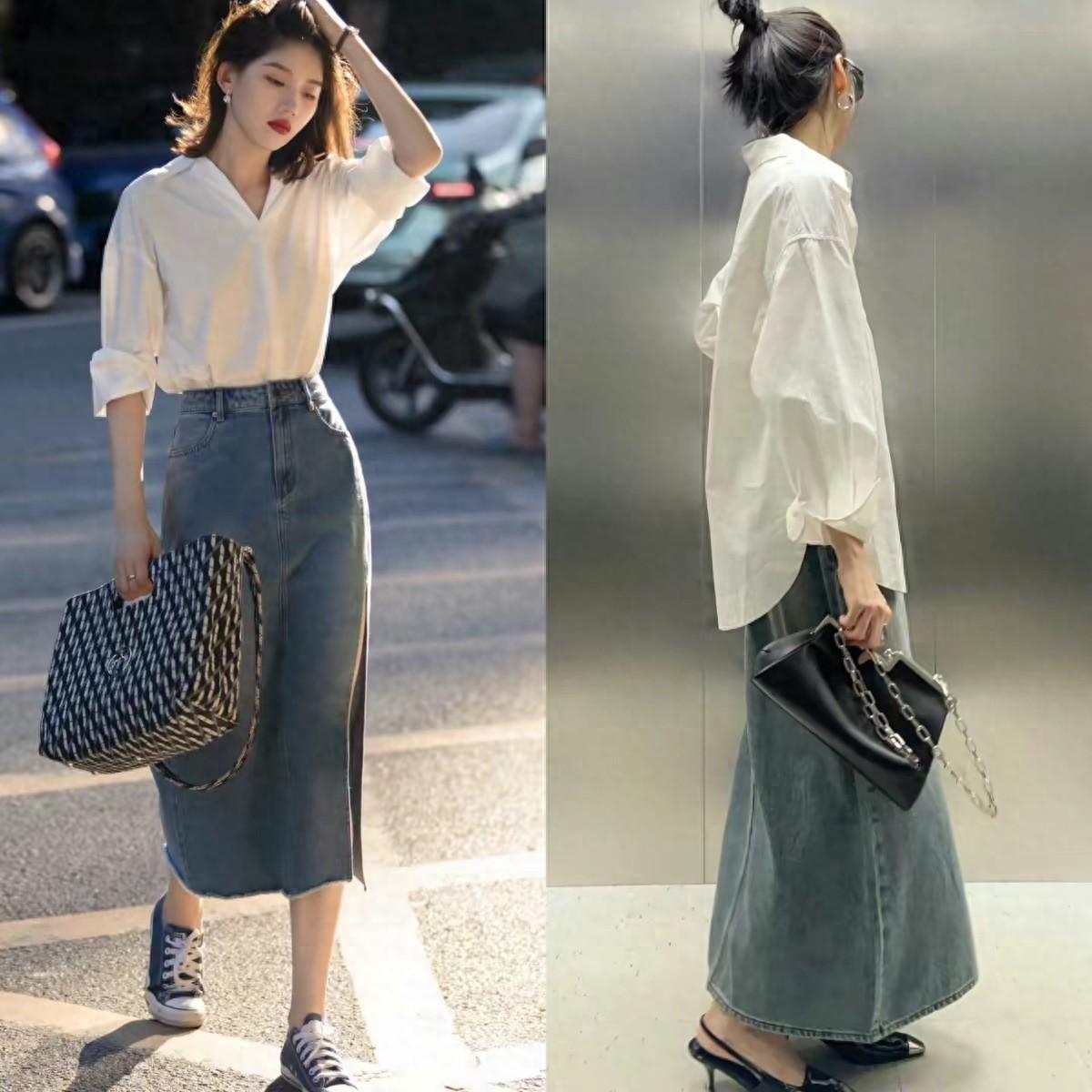 輕盈且舒適的白襯衫,我們可以配牛仔半身裙來穿着。直筒牛仔半身裙的大方,A字形牛仔半身裙的洋氣,都可以抬高我們的腰線、塑造出更加優越的比例感。