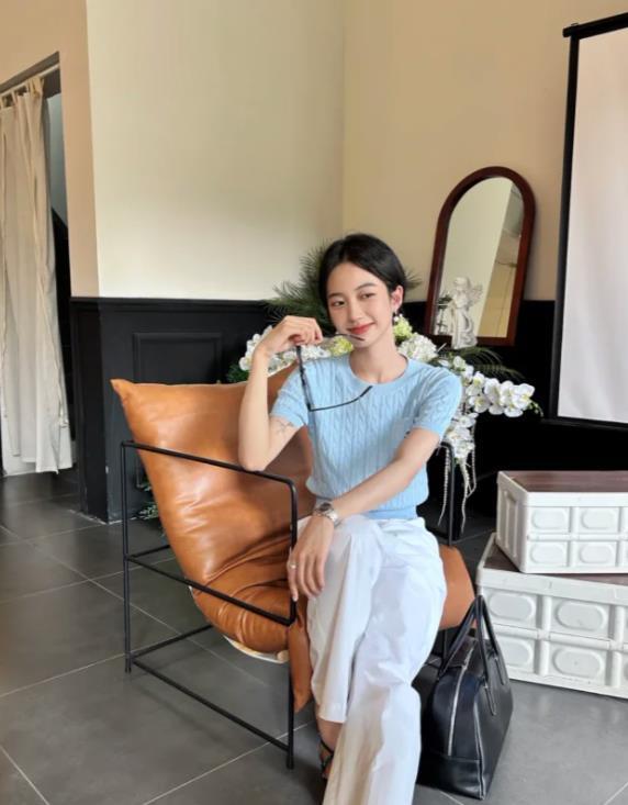 如果你想要打造出清新自然的風格,可以選擇一件淺色的薄針織,例如米白色、淡粉色等,這些色調都是很顯溫柔的,當然,也非常百搭。結合白褲子來穿,就能讓整個造型變得清爽起來。