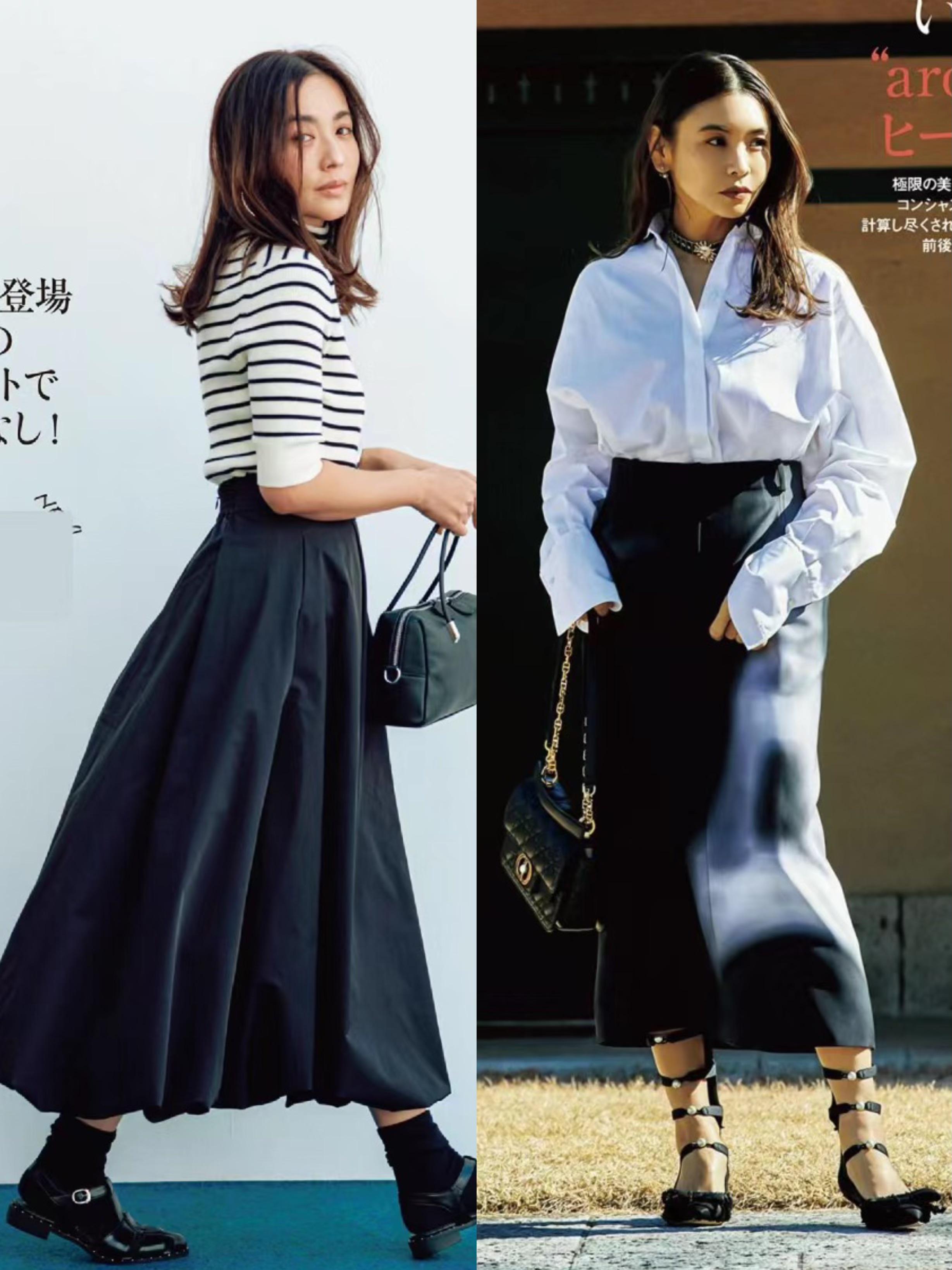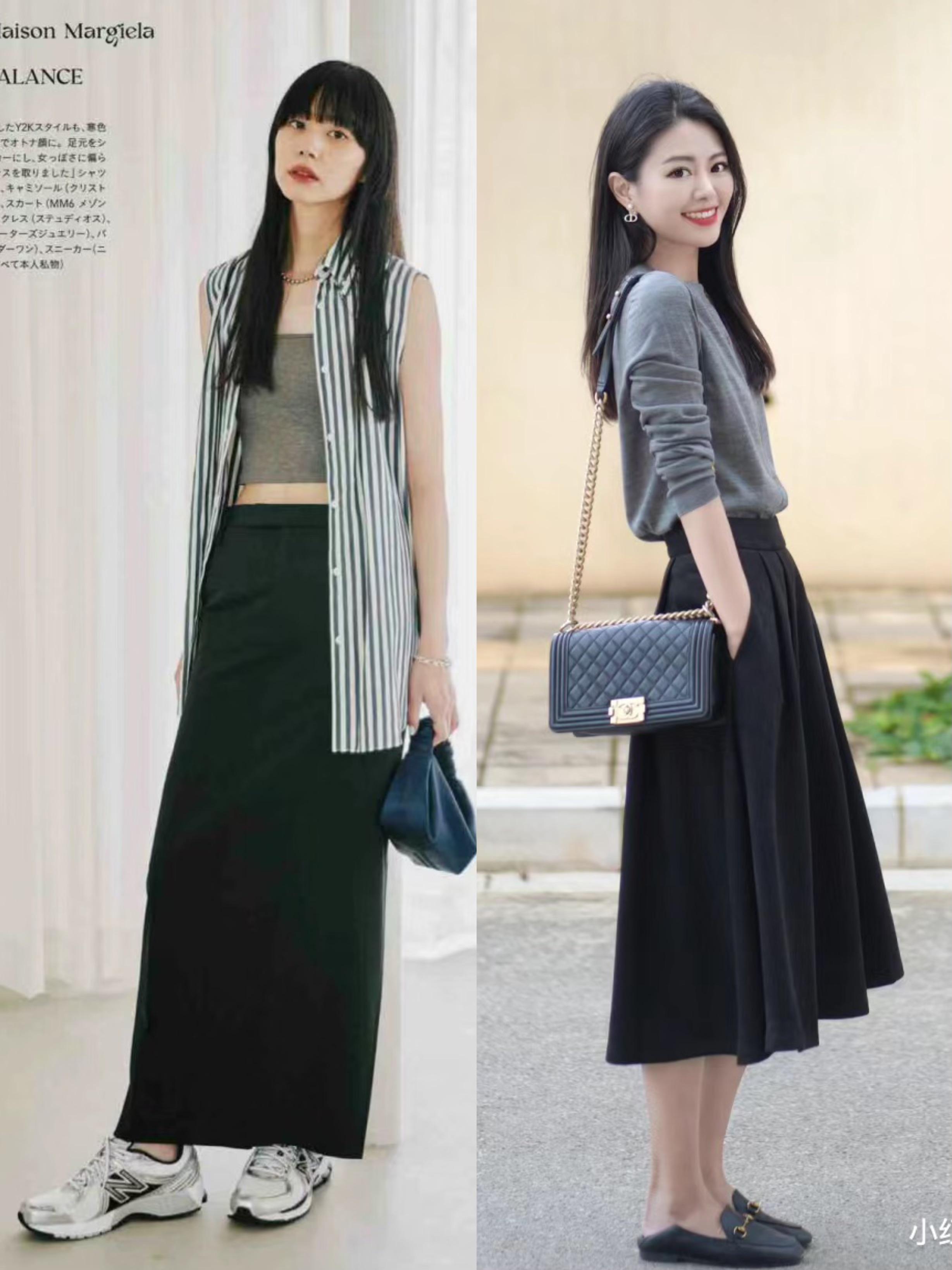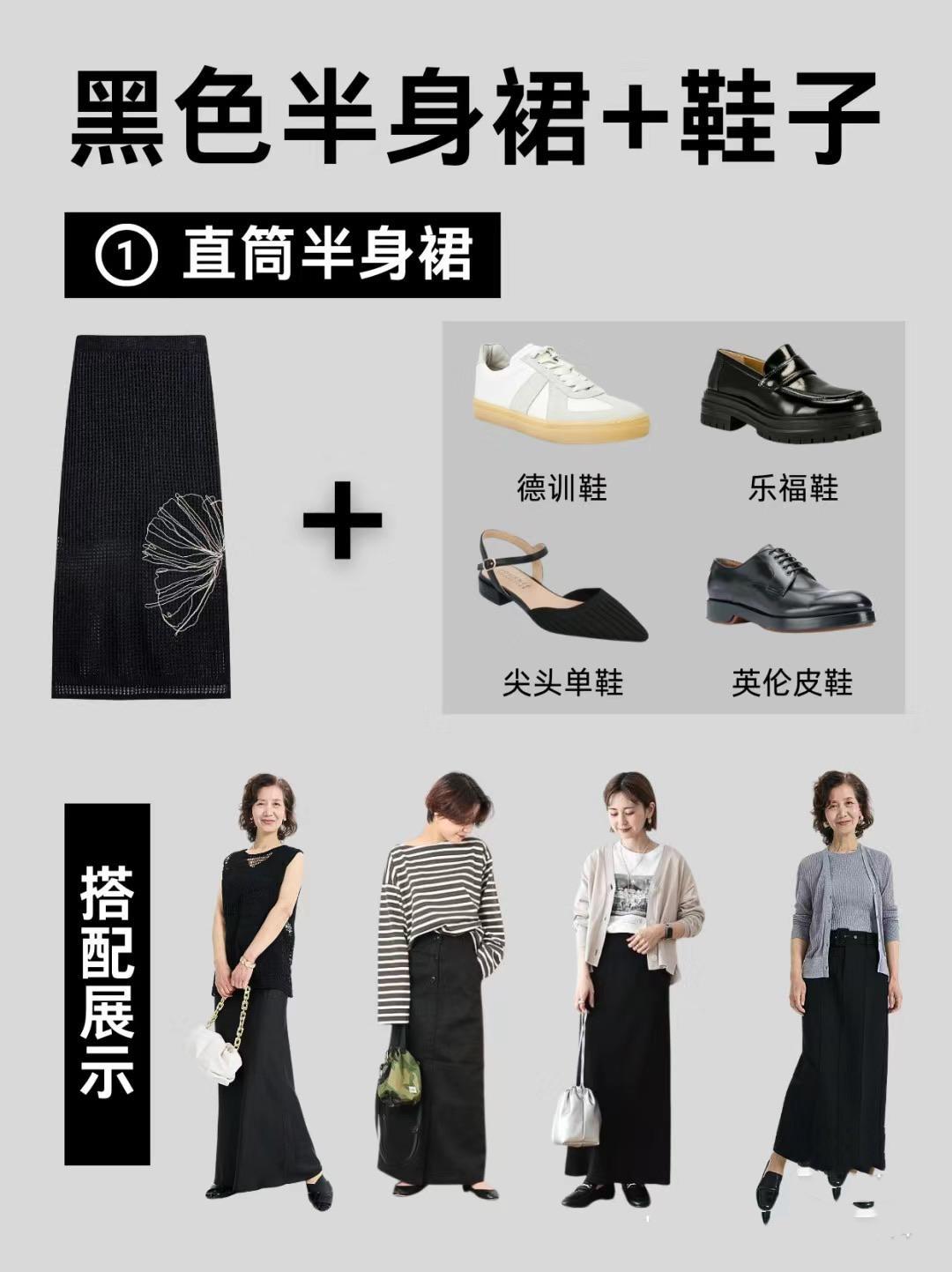 黑色直筒半身裙,也是非常大氣又百搭的。我們可以用黑色直筒半身裙來搭配德訓鞋/樂福鞋/尖頭皮鞋/英倫風皮衣。上衣可寬鬆可慵懶,風格氣質更多變。