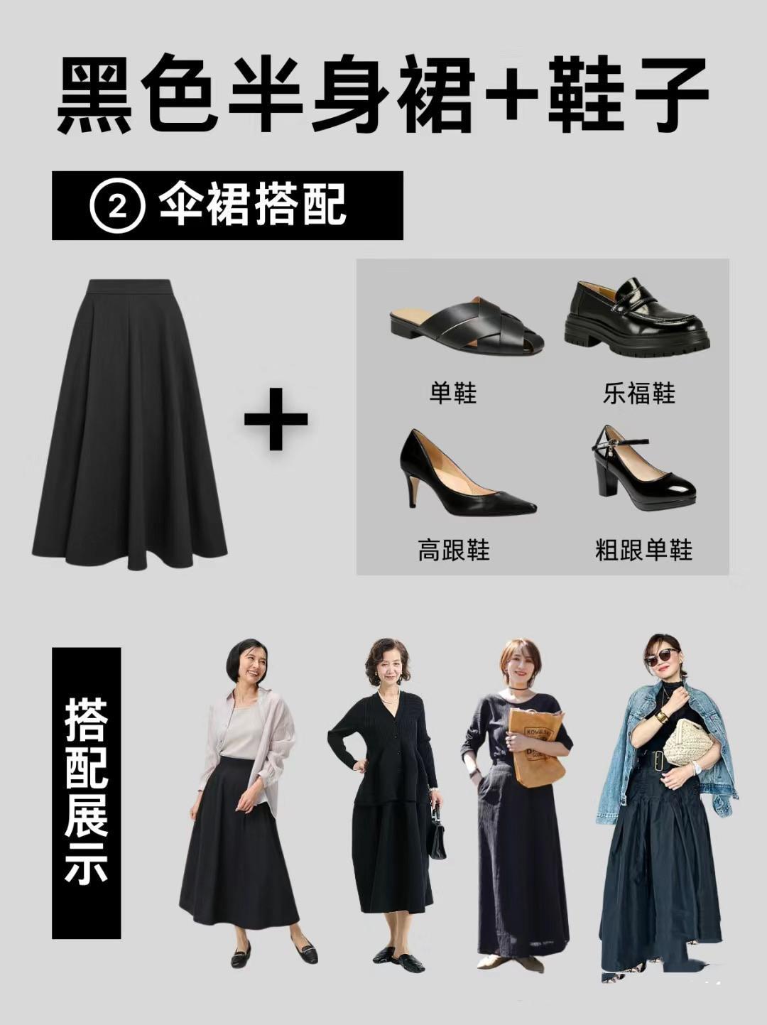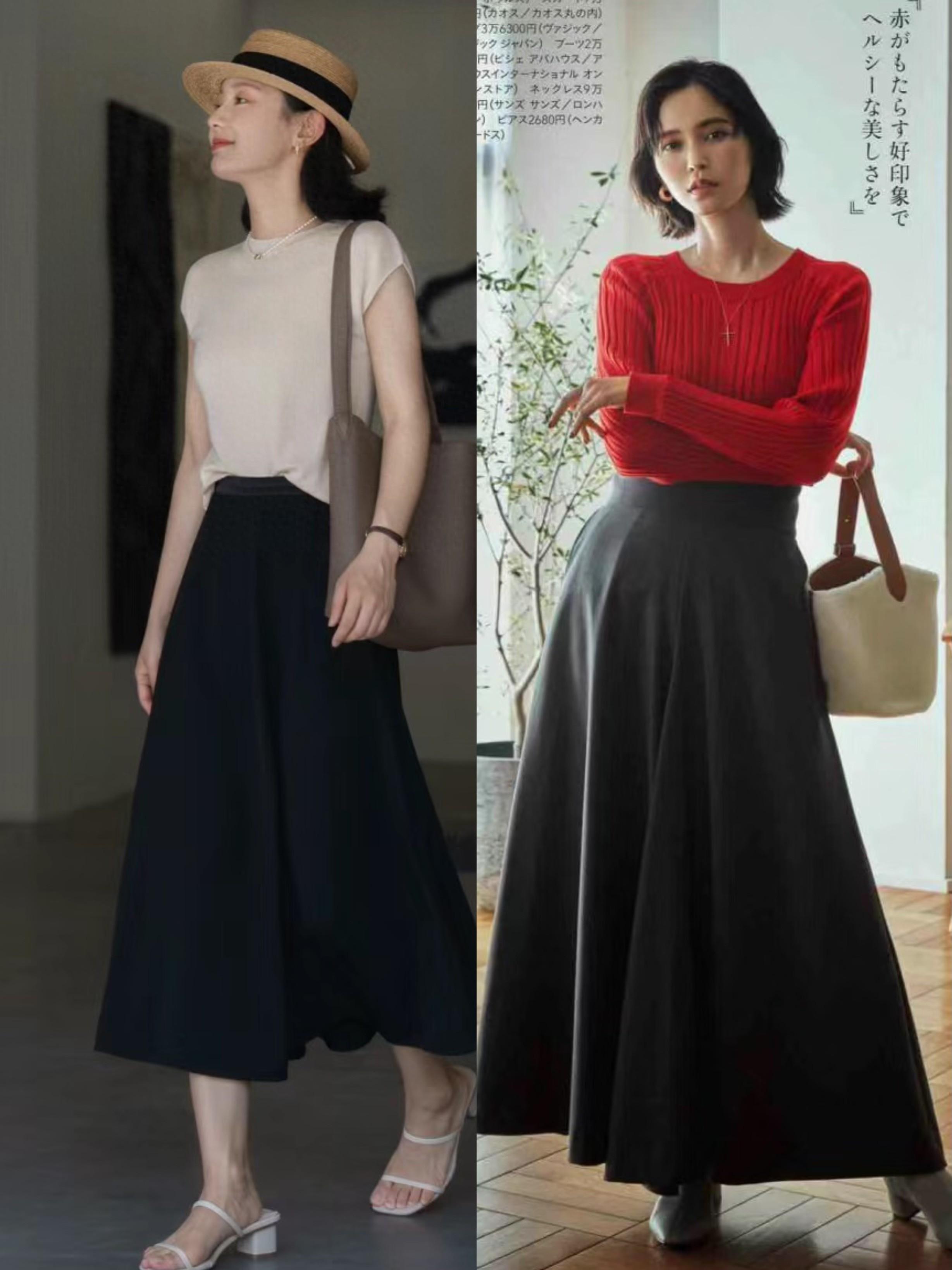一種包容性更強的黑色半身裙,傘裙的款式、大量感的剪裁、具備了更強的包容性。對於梨形身材、或者身材發福的中年女性來講,都是很友好的單品。
