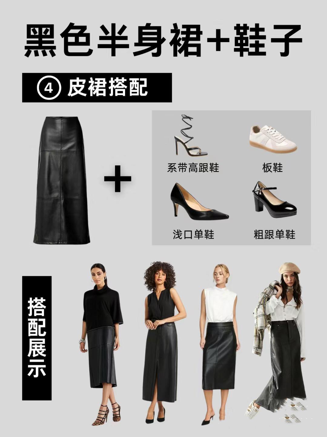 高腰的直筒品裙,可以搭配繫帶的高跟鞋、板鞋、淺口的單鞋、粗跟的單鞋等等。這種黑色皮裙,儘量配個性但不浮誇的元素,時髦高級卻更加醒目一些。
