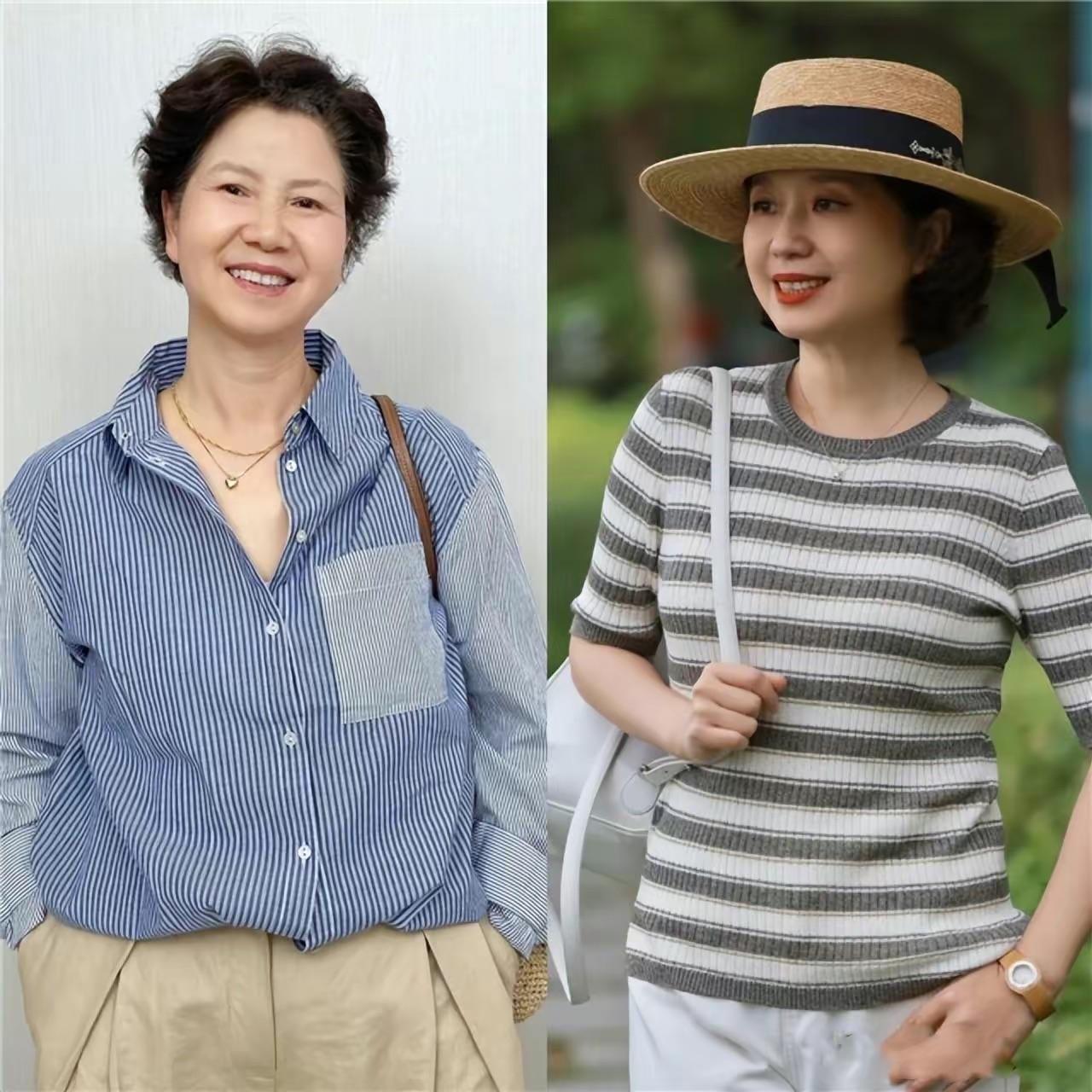 如果擔心純色淨版的T恤太乏味,那麼五六十歲的女人還可以選擇經典的條紋T恤來凹造型。舒適的條紋T恤,經典耐看且不挑人。