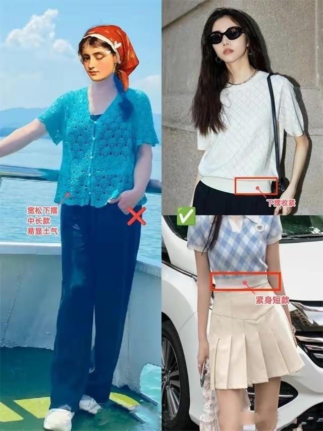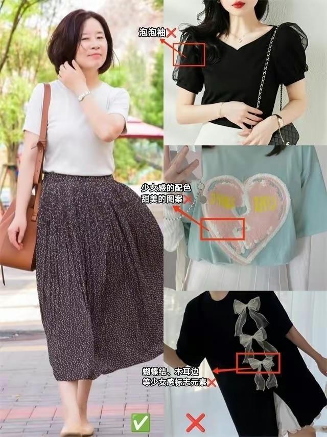 比如少女感太強的泡泡袖、或者配色太浮誇的T恤、以及點綴了蝴蝶結、木耳邊的修飾,都會顯得比較減齡洋氣。像這種設計元素多,且比較浮誇的T恤,就很容易顯得土氣。