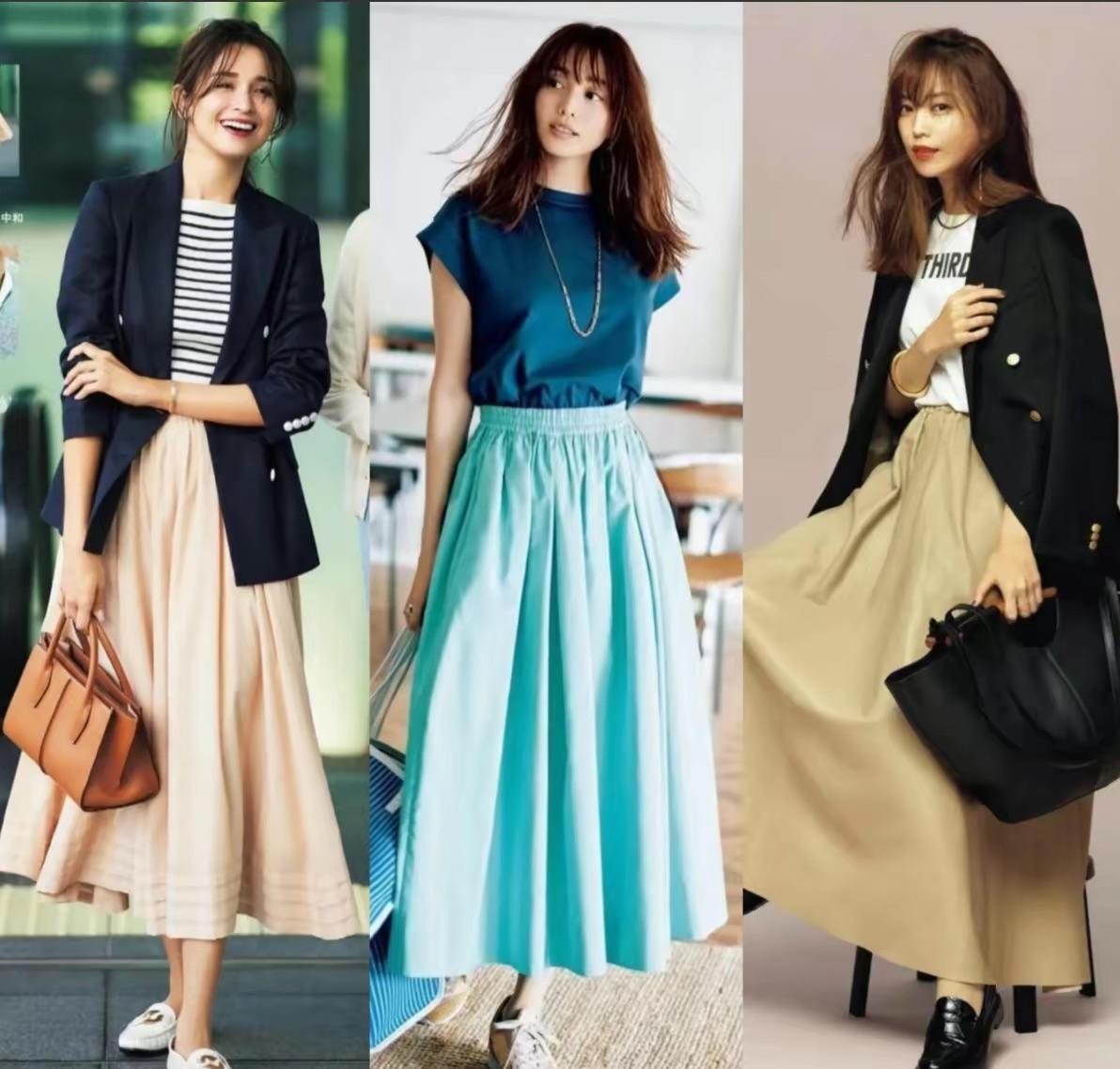 對於上了年紀的女人來講,選擇高腰傘裙的時候儘量搭配高腰封的設計,搭配寬大的裙襬更具包容性。大裙襬的高腰傘裙,配一雙樂福鞋就優雅體面。
