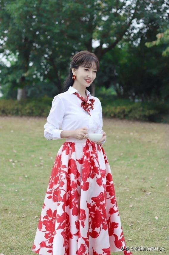 基礎色和彩色互相結合,不僅可以展現出個人風格,還能營造出整體比例協調、優雅大方的效果。這樣的穿搭特別適合大齡女性,不會顯得過分的張揚和花哨,同時還能夠提升整體品位。我們可以選擇經典百搭的白色襯衫結合明亮的紅色印花裙,以展現出更爲優雅和高貴的穿衣風格,簡直是美極了~