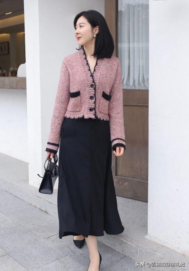 V領設計的上衣可以拉長頸部線條,讓我們的上半身得到一定的拉長效果。搭配小香風的版型設計,可以顯著增強整體穿着的精緻感。而簡約的黑色直筒裙,一方面能夠增加下半身的收縮效果,顯得更加纖細。另一方面在展現出身材曲線的同時,還可以展現出端莊大方的形象。