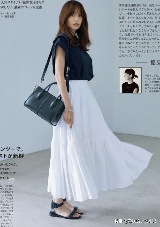 日本雜誌上面T恤+齊踝裙的搭配選用的顏色系列幾乎是沒有任何限制的,所以也建議大家完全可以根據自己的喜好又或者是根據場合來進行優選,像黑白灰這樣的百搭系列完全可以多多入手,又或者搭配彩色相從視覺上而言能夠提升亮點和豐富度的。