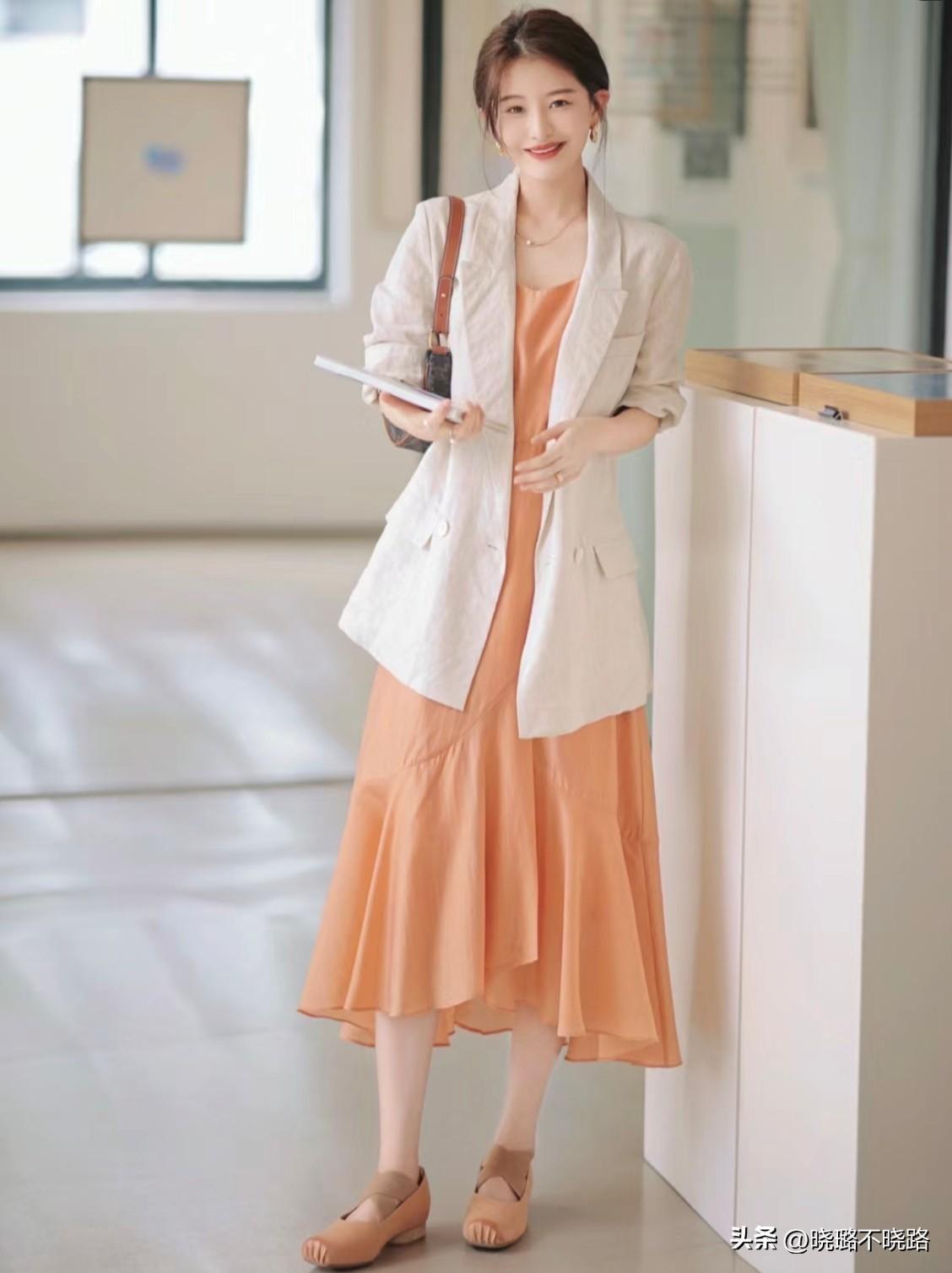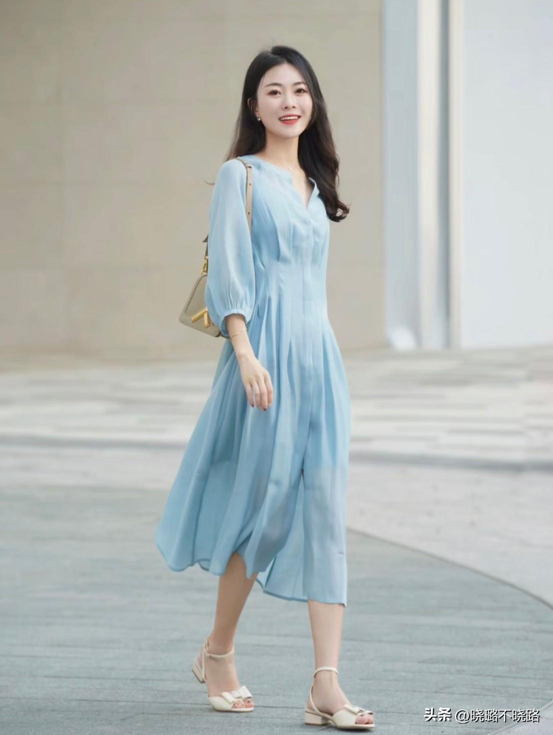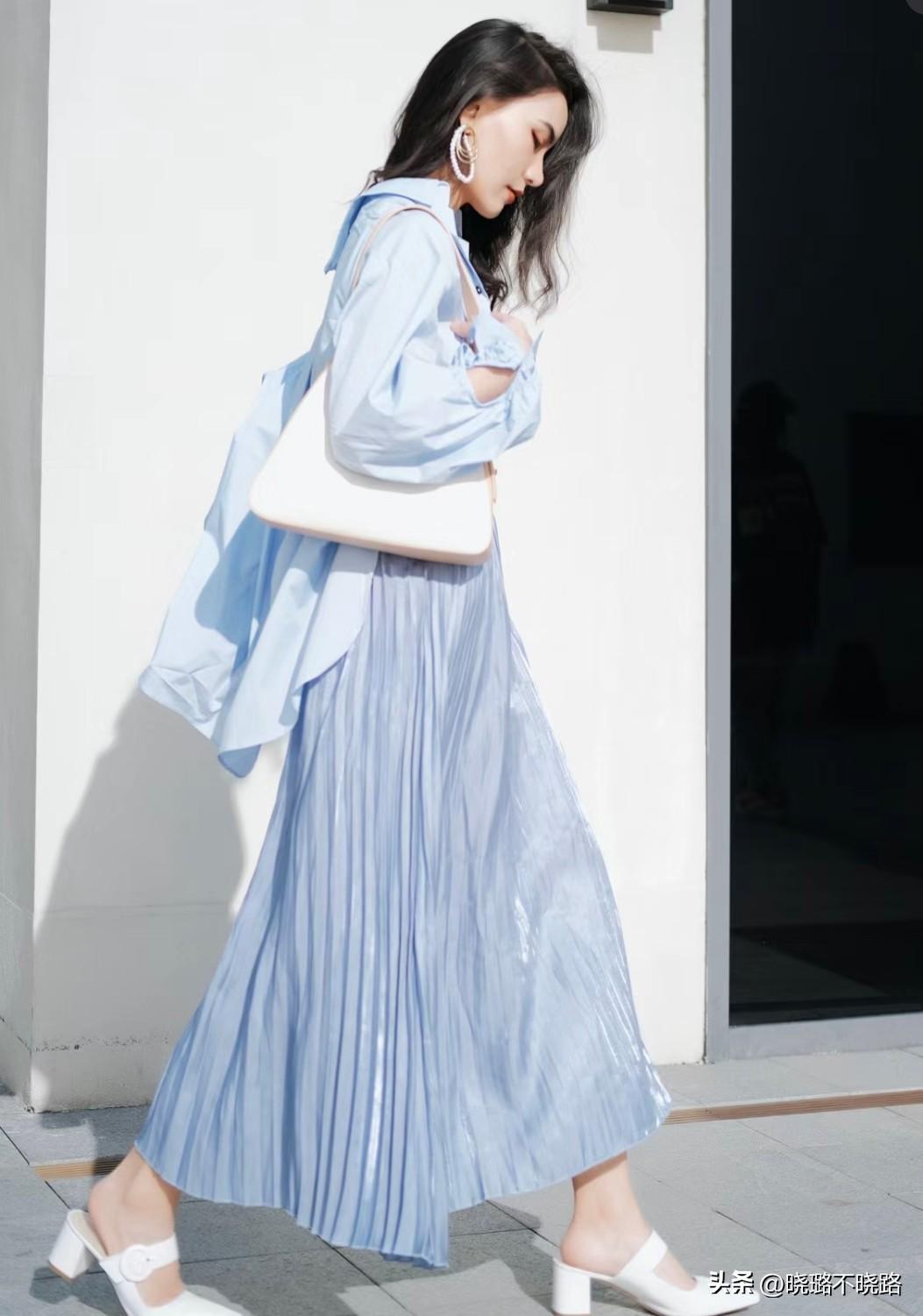 這一款顏色的搭配在春夏季節的時候有一個必要的展現重點就是還是要注重一定的露膚感襯托,所以即便是長款的單品,也建議大家可以露出來一小截白皙的腿部線條,又或者是直接搭配低領的上衣單品。襯托肌膚白皙的同時也能夠彰顯女性獨有的優雅以及溫柔的感覺。