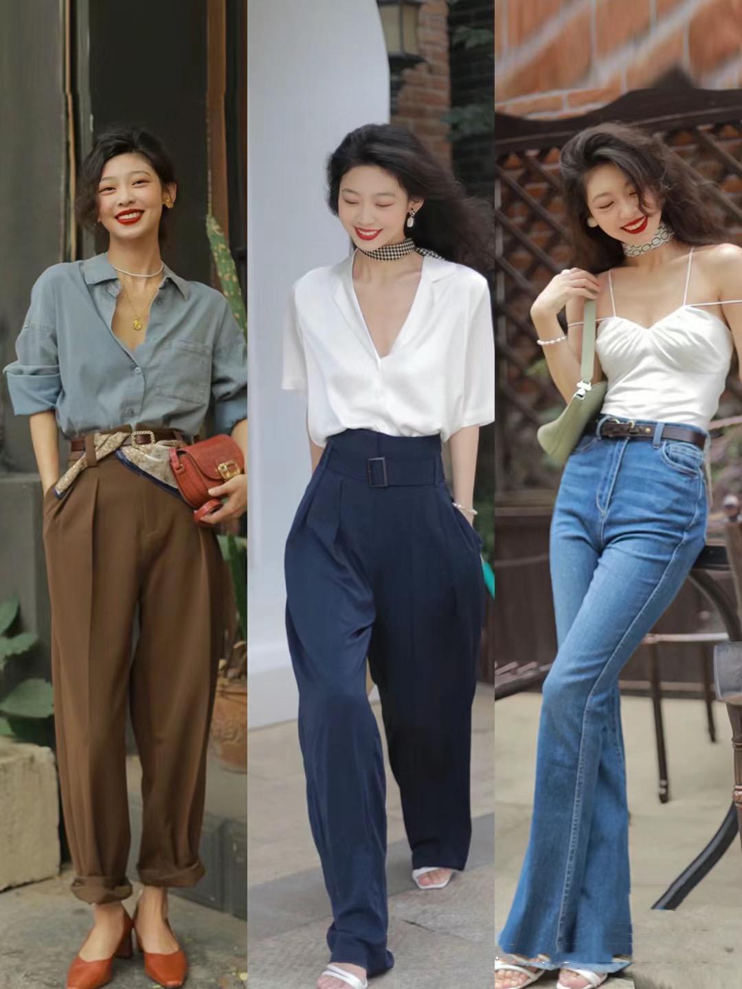 不管是牛仔襯衫、還是經典的白色襯衫,都可以配高腰的錐形褲來穿着。高腰的錐形褲可以搭配收腰的設計,配上立體打褶的設計,包容腰胯部的厚重,利落輕盈又大方。