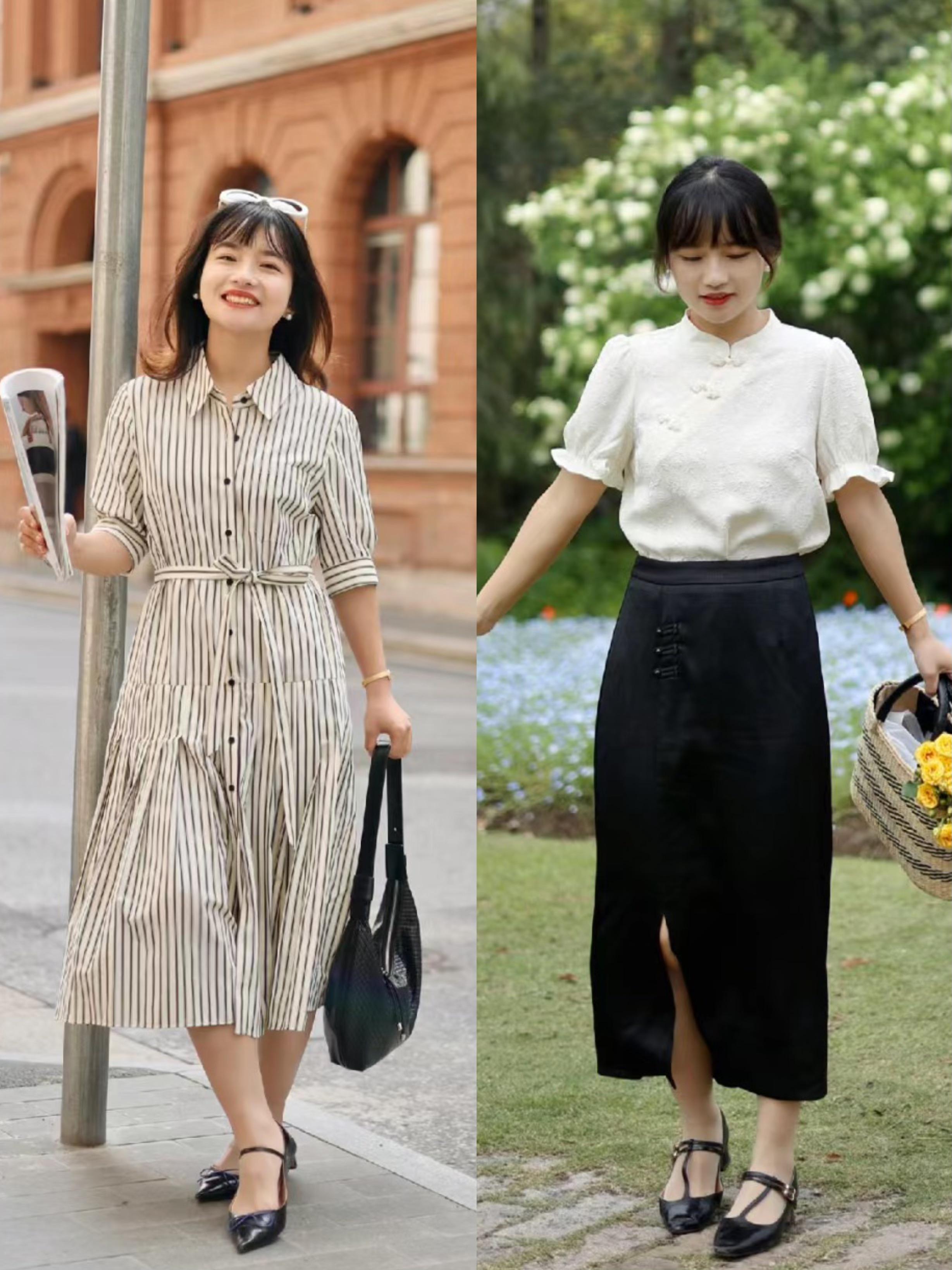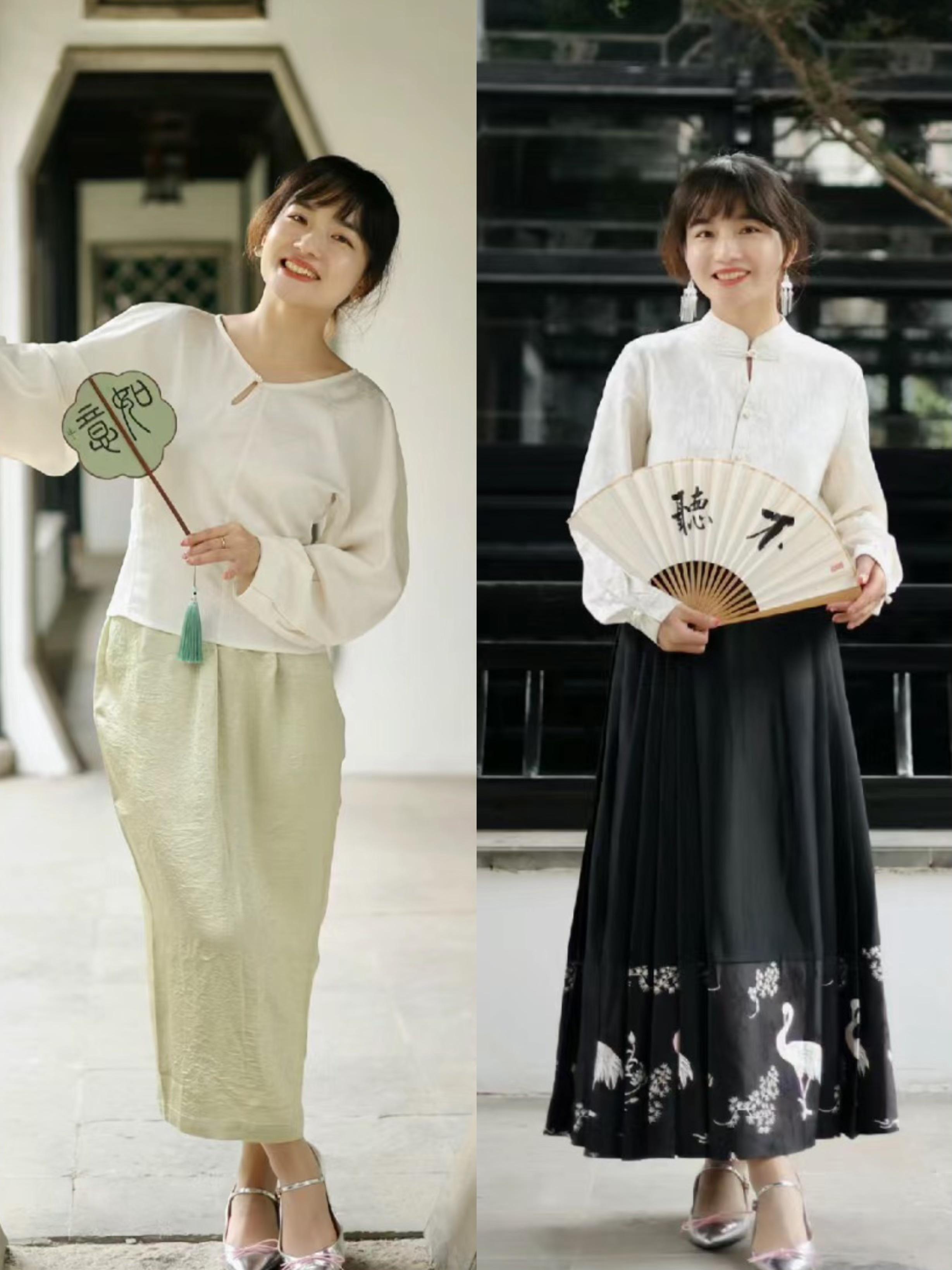 春夏季節選擇馬面裙的話,儘量選擇輕薄一點的面料。既要輕薄又要注意版型的挺闊,纔可以彰顯出氣質的高級。馬面裙搭尖頭的中跟鞋、也是大方優雅。