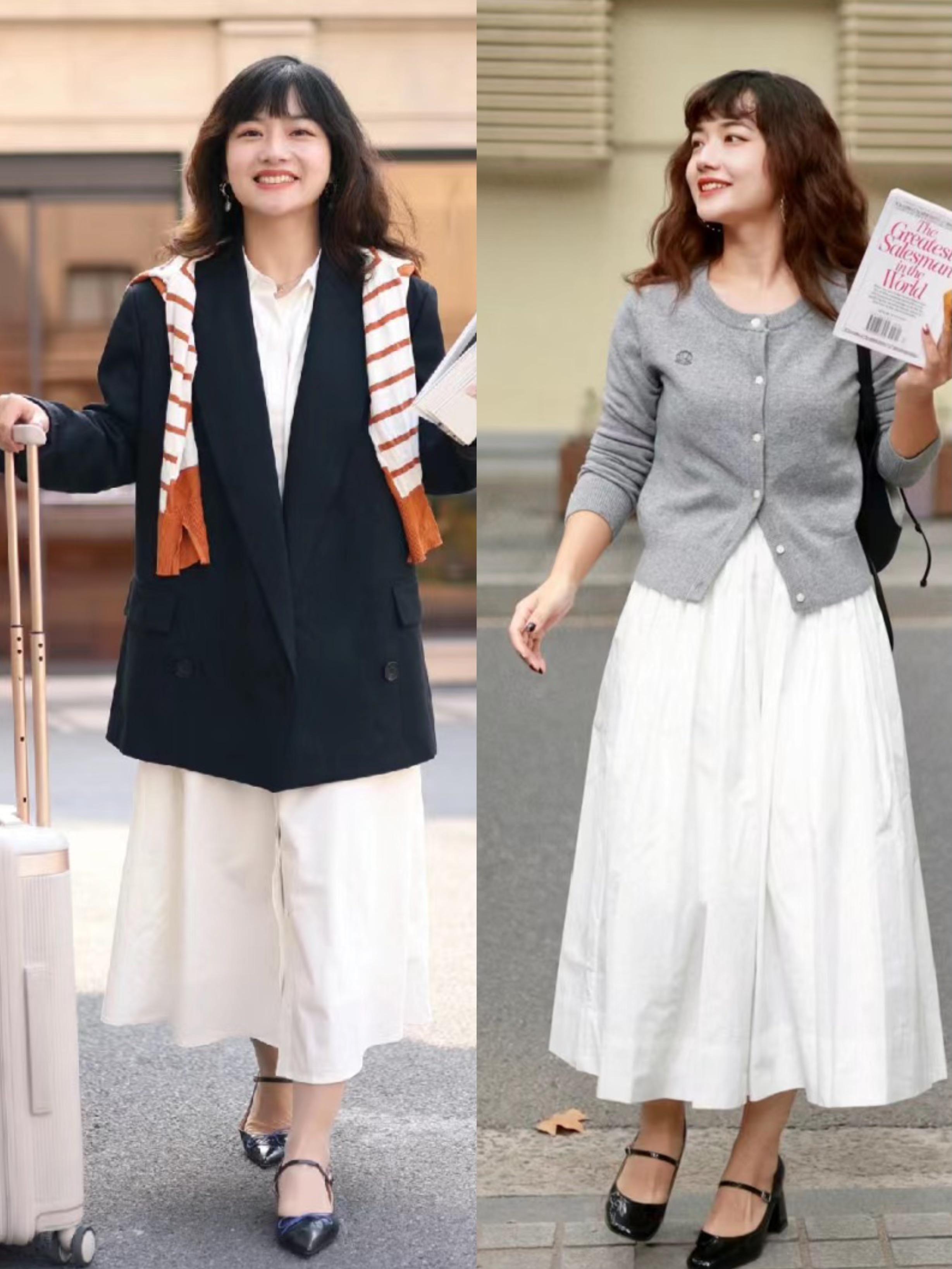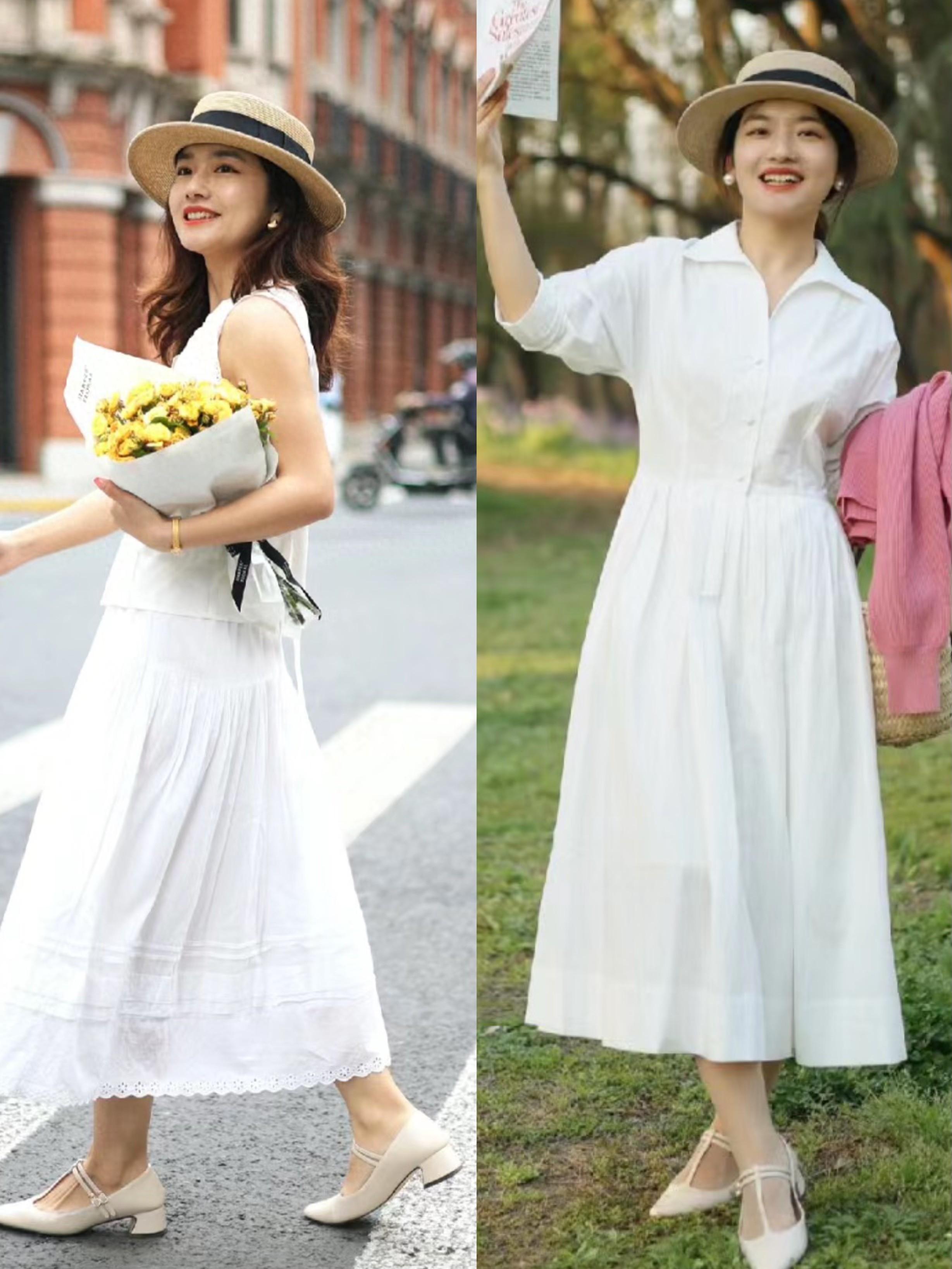 像這種經典的白色半身裙,以A字形的裙襬出現,包容性更強、也非常的大方。白色半身裙可以配黑色中跟鞋,經典的黑白配內斂又顯高。