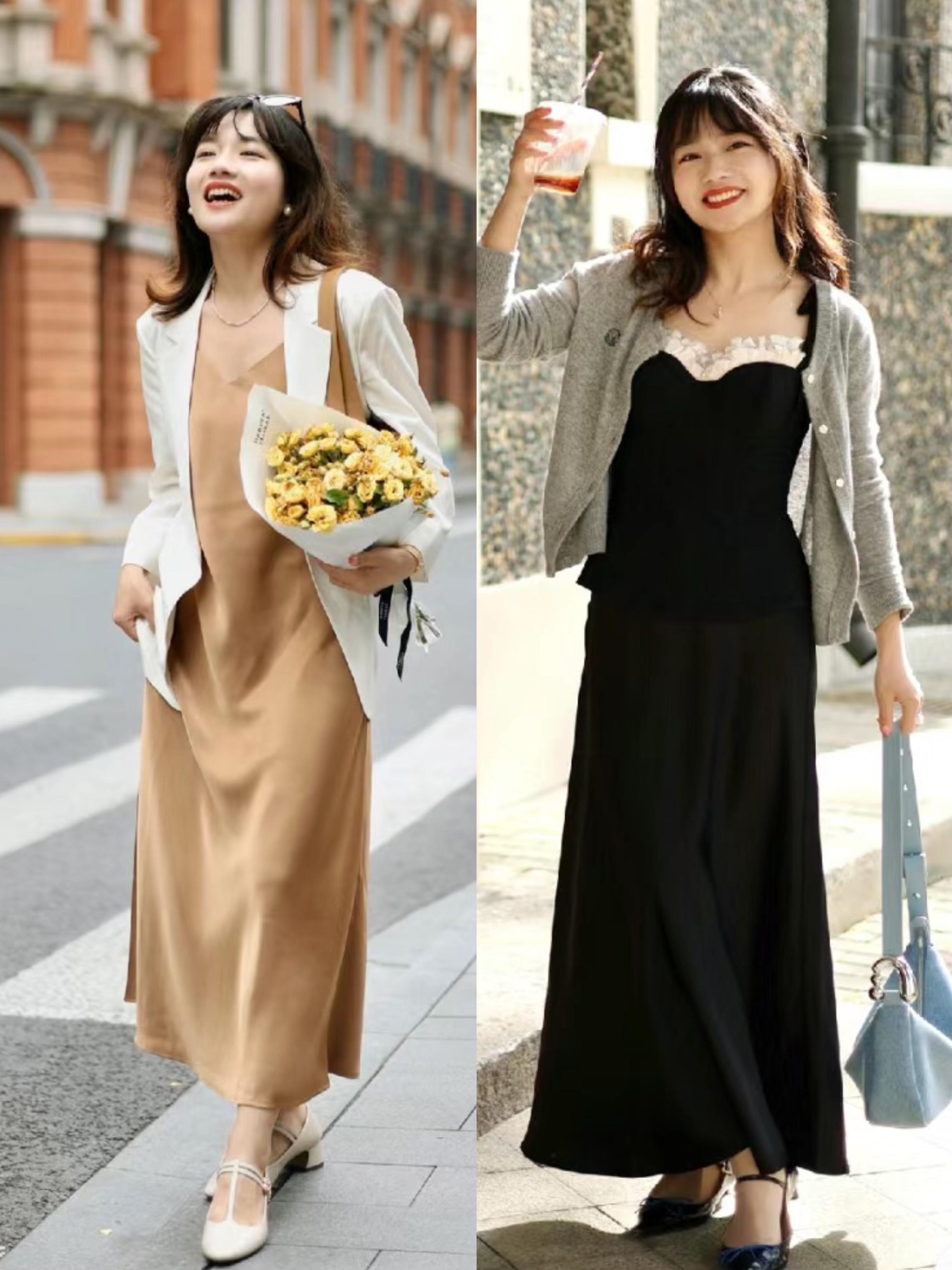 醋酸面料或者絲絨面料搭吊帶連衣裙,都是一種自帶光澤感、且非常高級顯貴的單品。尤其是醋酸吊帶裙,輕盈又垂順,把成熟女性的優雅與貴氣自然表達。
