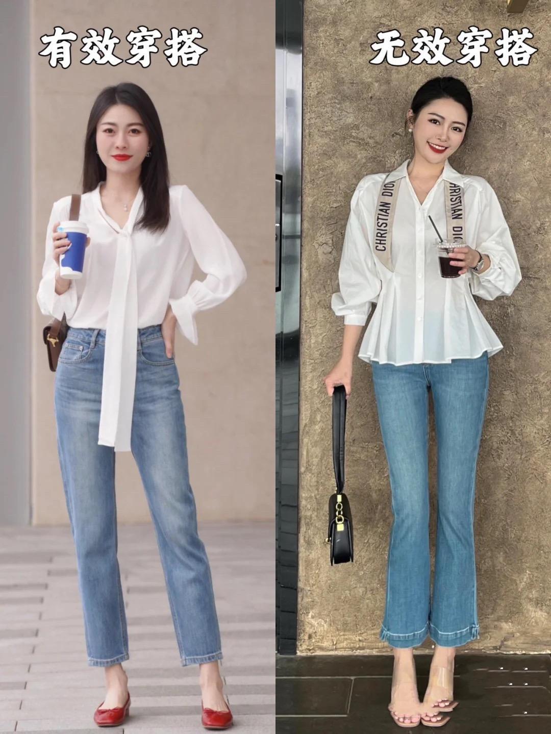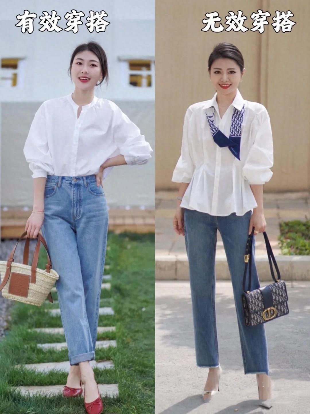 比如同樣是白襯衫+牛仔褲的搭配,隨意穿就更加舒適一點,白襯衫的下襬並沒有塞褲腰,雖然不顯高但很舒適。時髦穿搭方式,就是將白襯衫塞衣角,並且配挽起褲筒、搭一雙色明亮的鞋子,大方醒目又顯高。