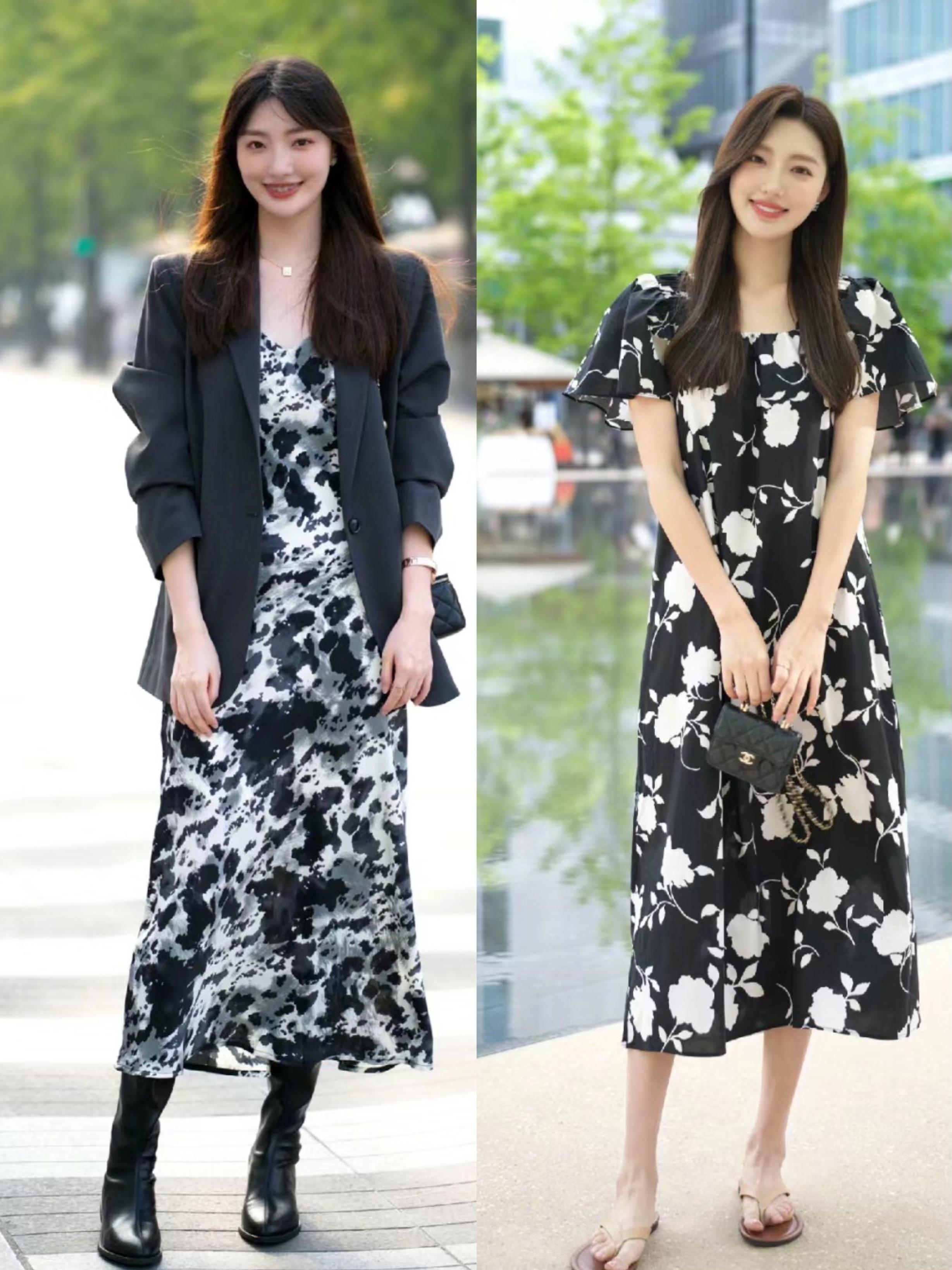 如果擔心純色系的穿搭太乏味,還可以在自己的穿搭中融入印花的元素。優雅的印花連衣裙,以經典黑爲底色、特別的高級醒目。
