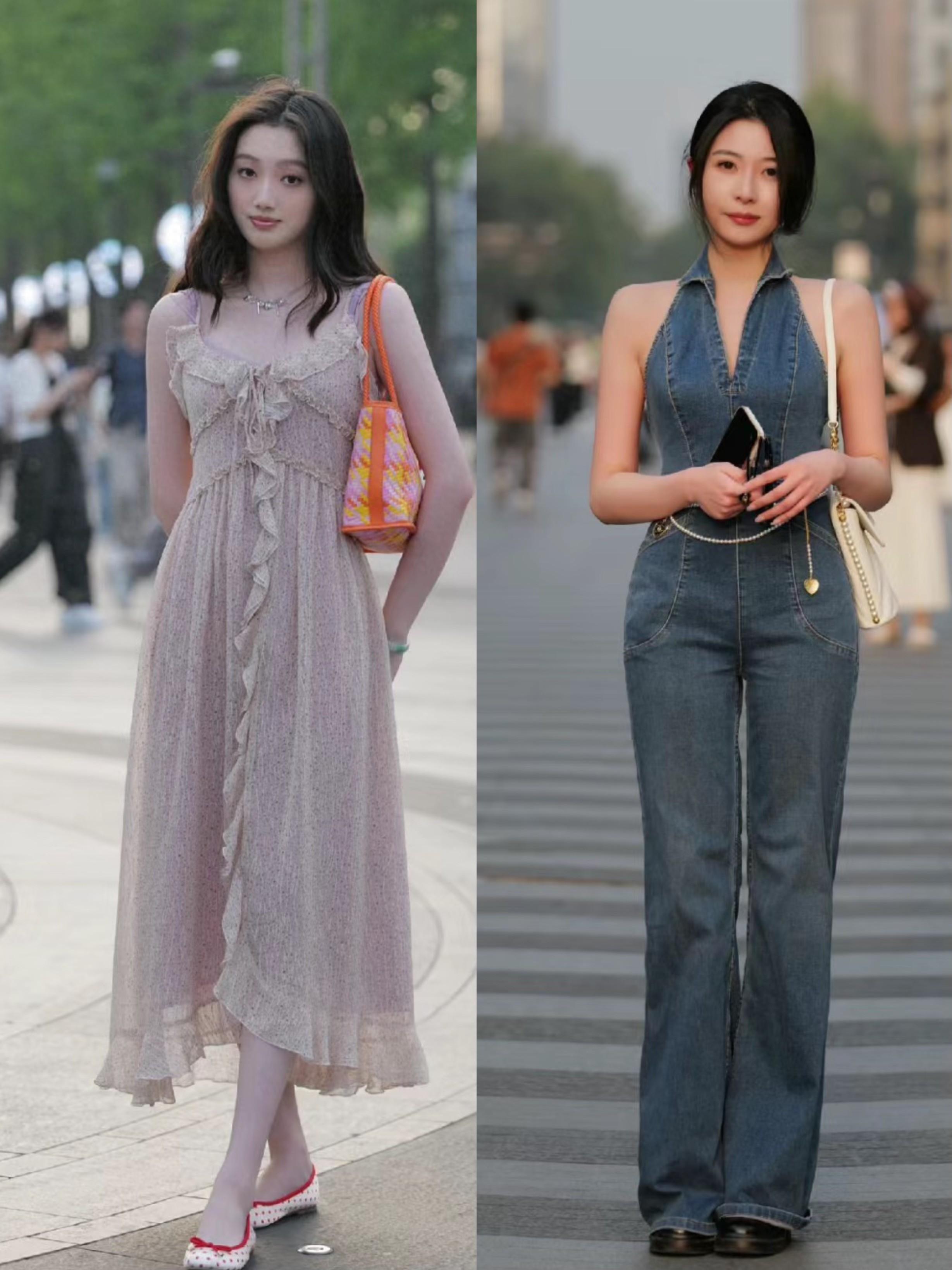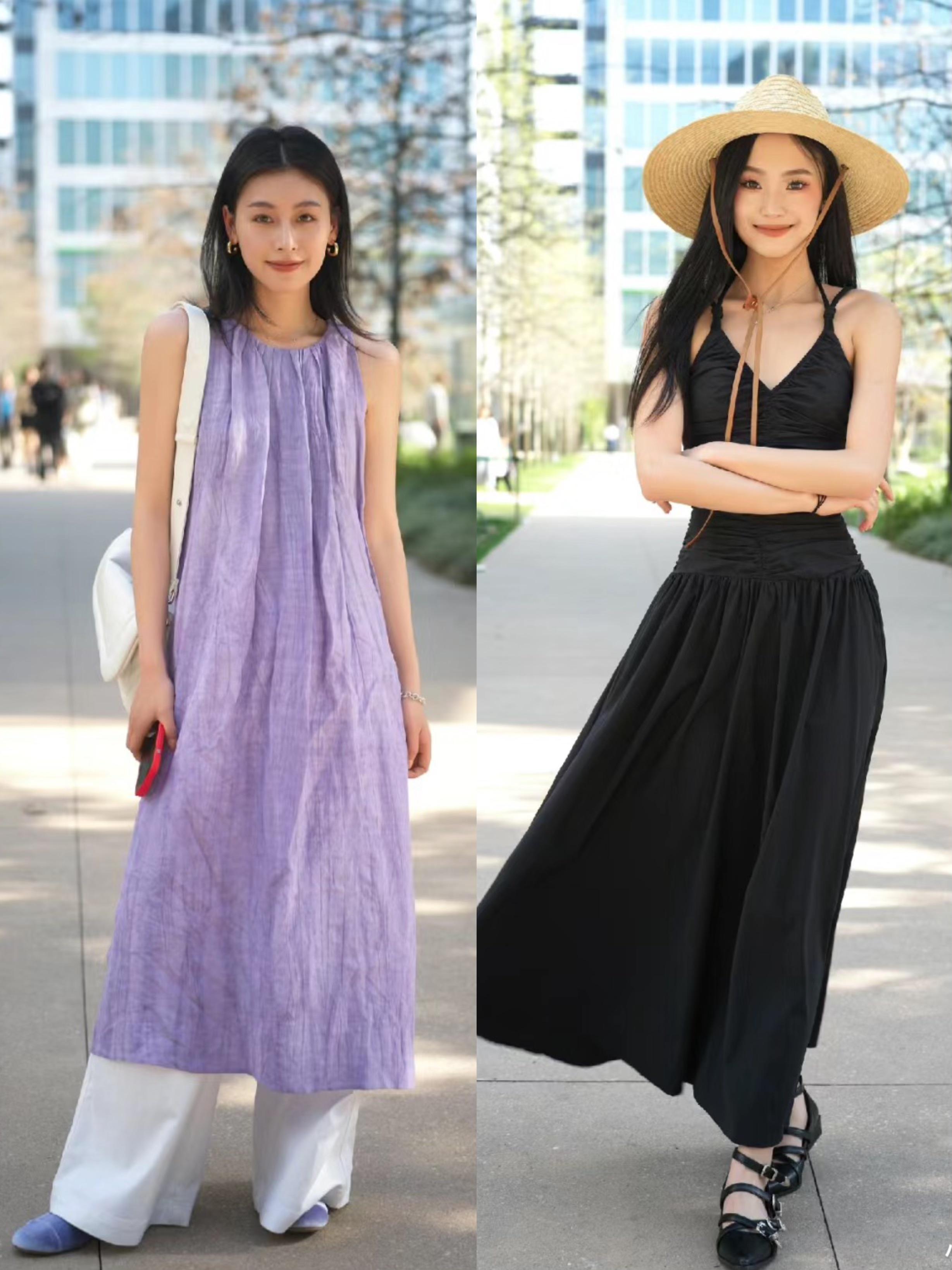 春夏度假穿着,吊帶裙和掛脖裙都各有千秋。掛脖裙露出後背和肩頸部線條,更加惹眼。吊帶裙更加低調一點,但細吊帶的長裙,依然是性感時尚的。