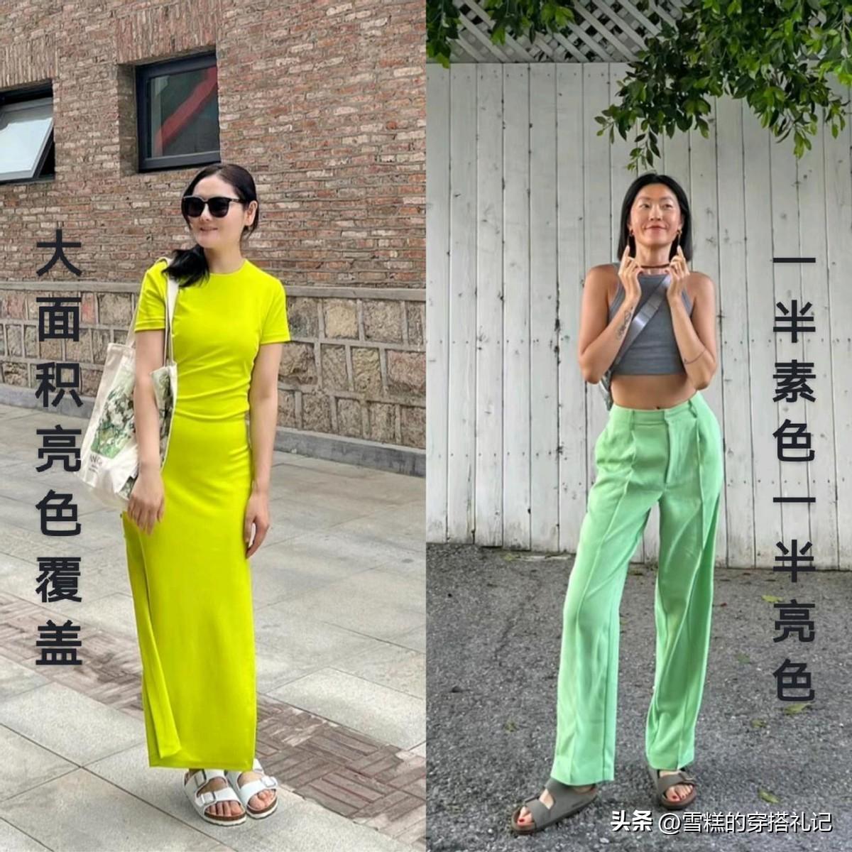 大面積亮色系覆蓋的連衣裙,要選擇足夠襯膚顯白的顏色,適當的露出皮膚面積更清爽;也可以將亮色用於下裝,搭配素色的背心、吊帶,去營造出平衡感。