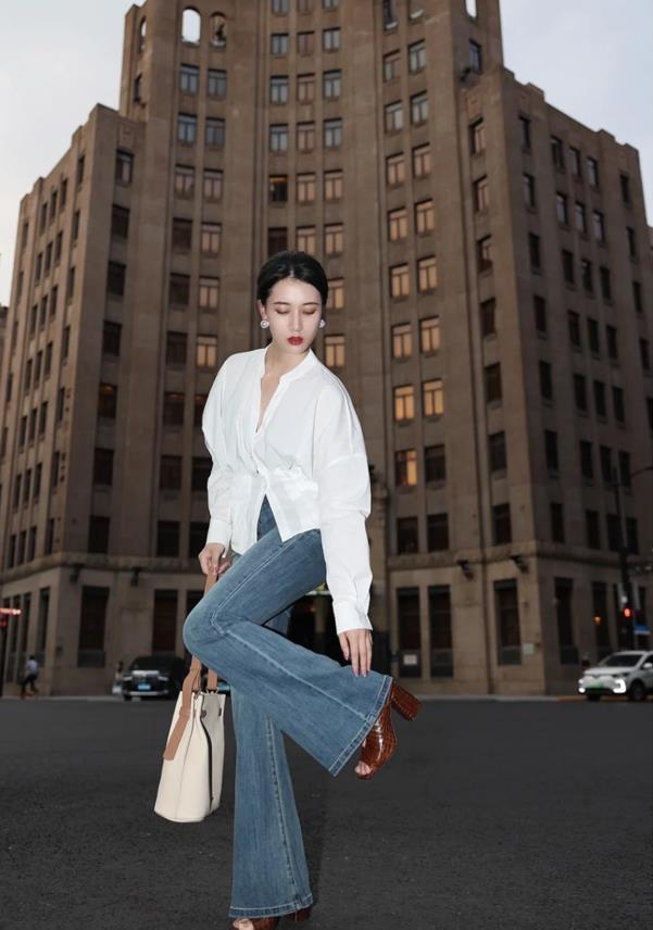 白襯衫作爲最基礎的搭配,具有極高的搭配性和實用性,它是很簡潔乾淨的款式,無論在什麼場合,什麼年齡段,都可以輕鬆駕馭。而選擇牛仔微喇褲來配,則顯得很復古氣息,微喇的褲型,很好修飾了腿型,又能打造出一種復古的調調。