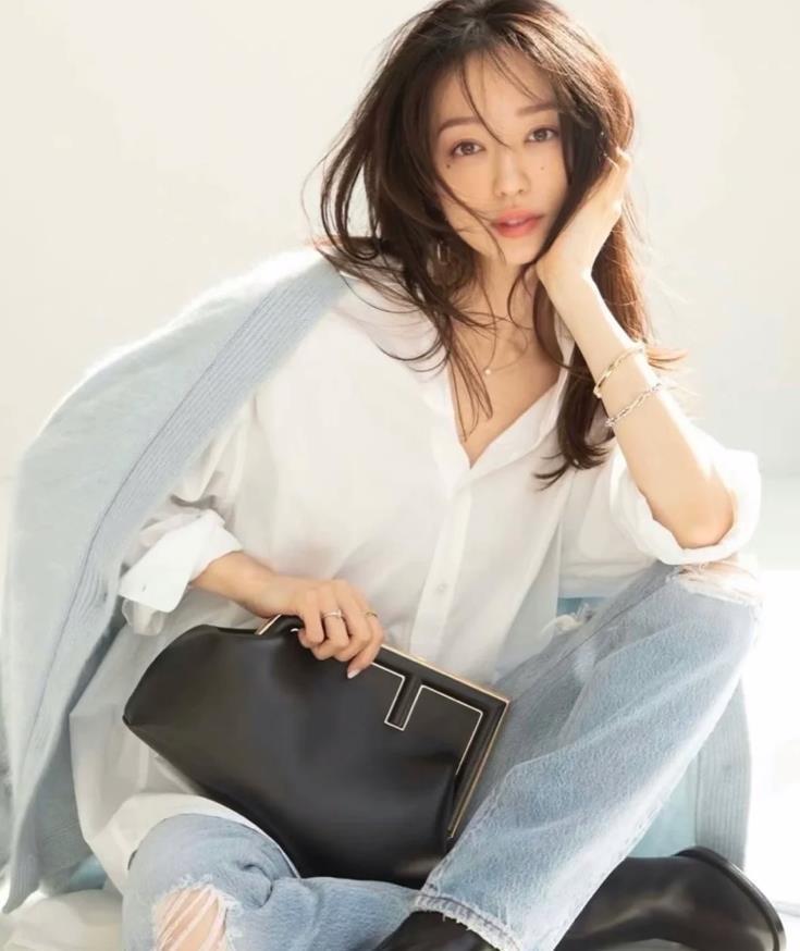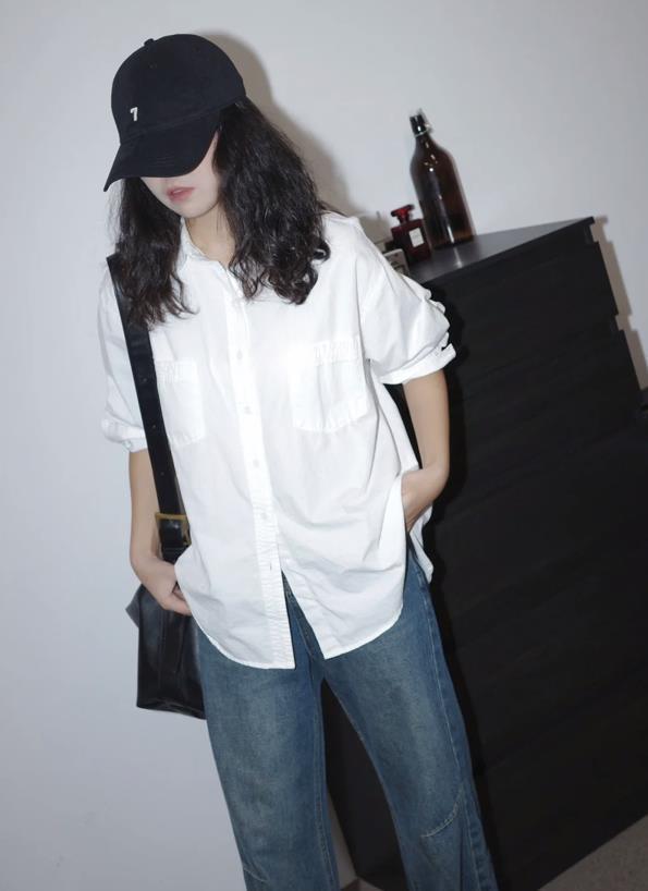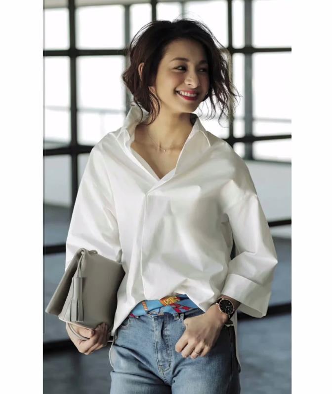 選擇白襯衫+牛仔褲的穿搭,也要注重下穿搭細節,白襯衫與牛仔褲看似很簡單百搭,但要穿出時尚感,就要在細節上下功夫。例如你可以將襯衫的領口微微敞開一些,露出鎖骨和頸部肌膚,這樣有助於優化脖子的線條。