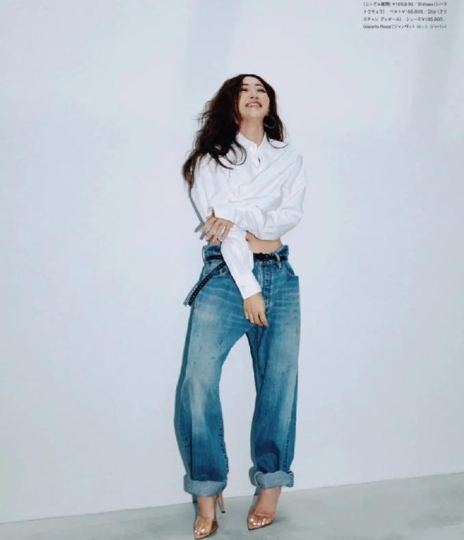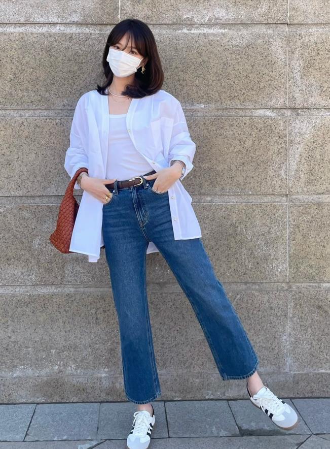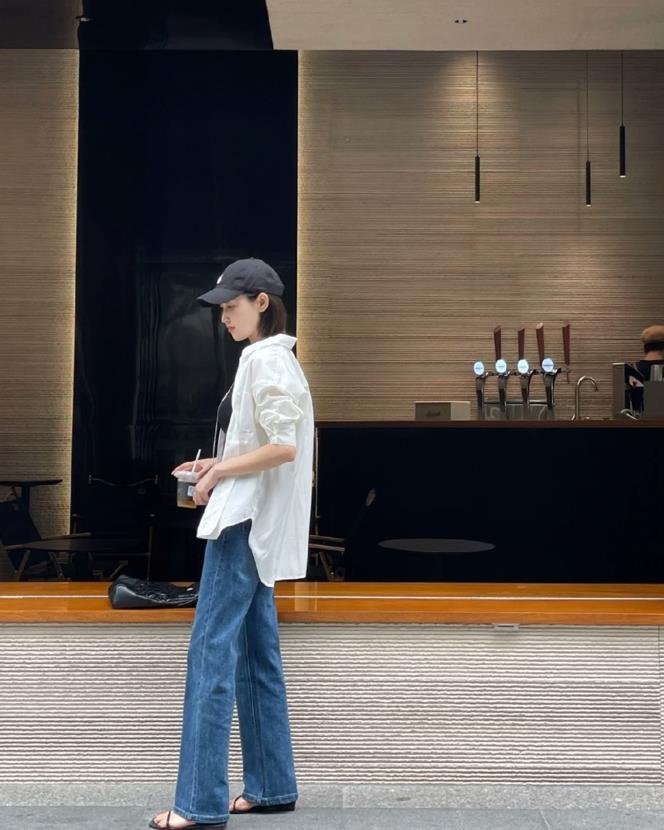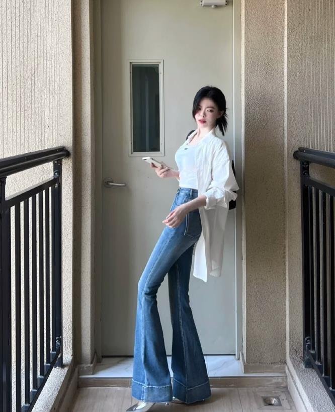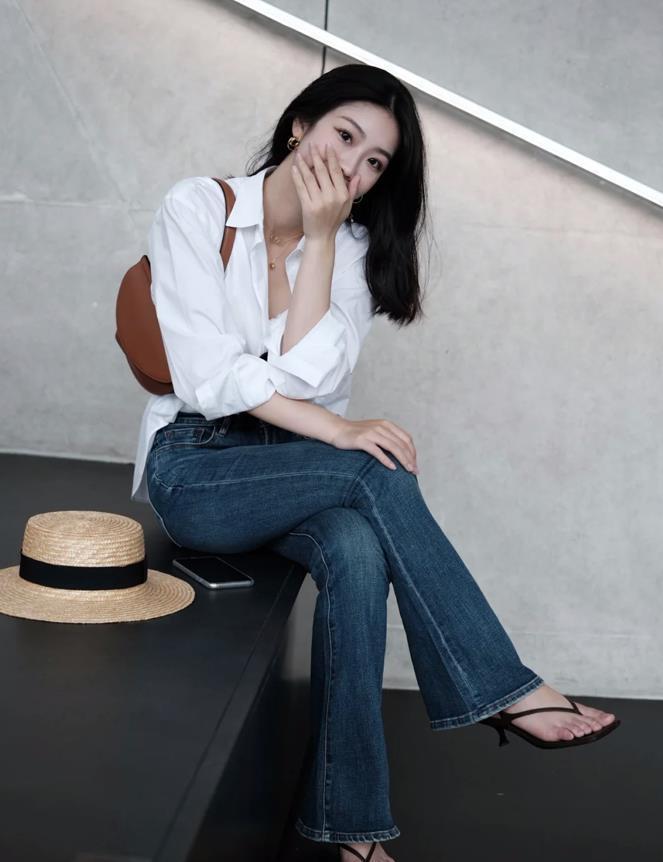 在夏季,選擇一款輕薄透氣的白襯衫,搭配一條淺色微喇牛仔褲,既清爽乾淨又時尚,選擇高腰的款式,很好拉長腿部線條,並且在視覺上顯高。