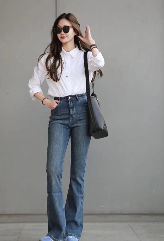 當白襯衫和微喇牛仔褲相遇,就如同黑白配一樣,是那麼和諧,這樣的穿法不僅適合日常休閒場合,還可以輕鬆應對其他一些正式場合,搭配小白鞋,就顯得更休閒舒適,配高跟鞋的話,則不失優雅氣質和女人味。