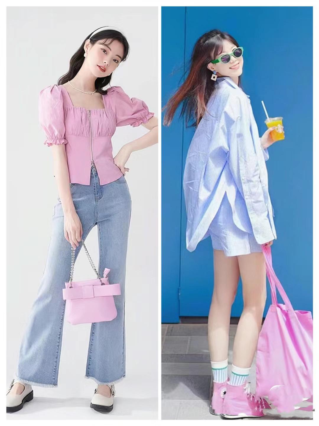 像這種淺藍色的襯衫、牛仔褲,都可以隨意的搭配粉色系單品。粉色亮度雖高、但飽和度比較低,自帶溫柔氣質。藍粉配色、既乾淨又減齡。