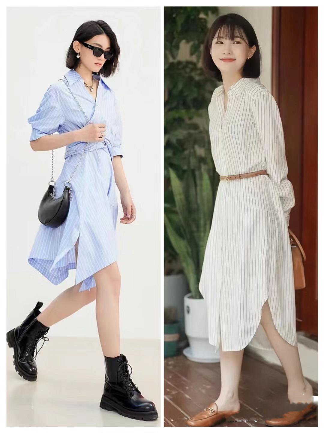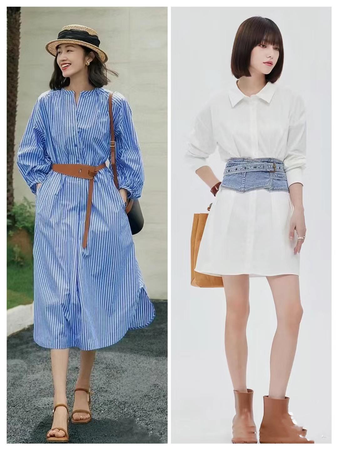 藍白條紋襯衫裙,以寬鬆的版型著稱,風格可塑性更強。在藍白條紋襯衫之上,可以配棕色腰帶勾勒出高腰線。棕色腰腰帶與棕色鞋子呼應,時髦度更強。
