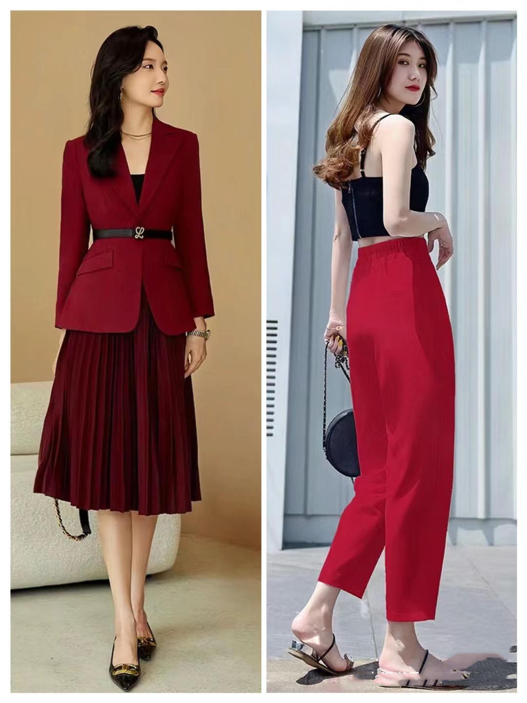 如果想要更內斂一點的風格,我們可以嘗試飽和度更高的酒紅色。酒紅色西服外套搭配百褶裙,優雅又浪漫。