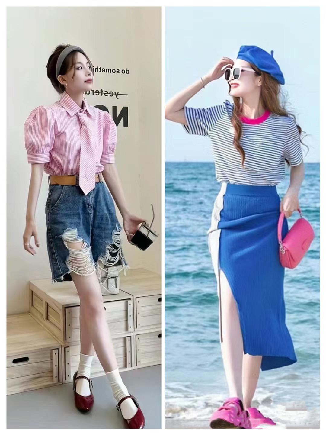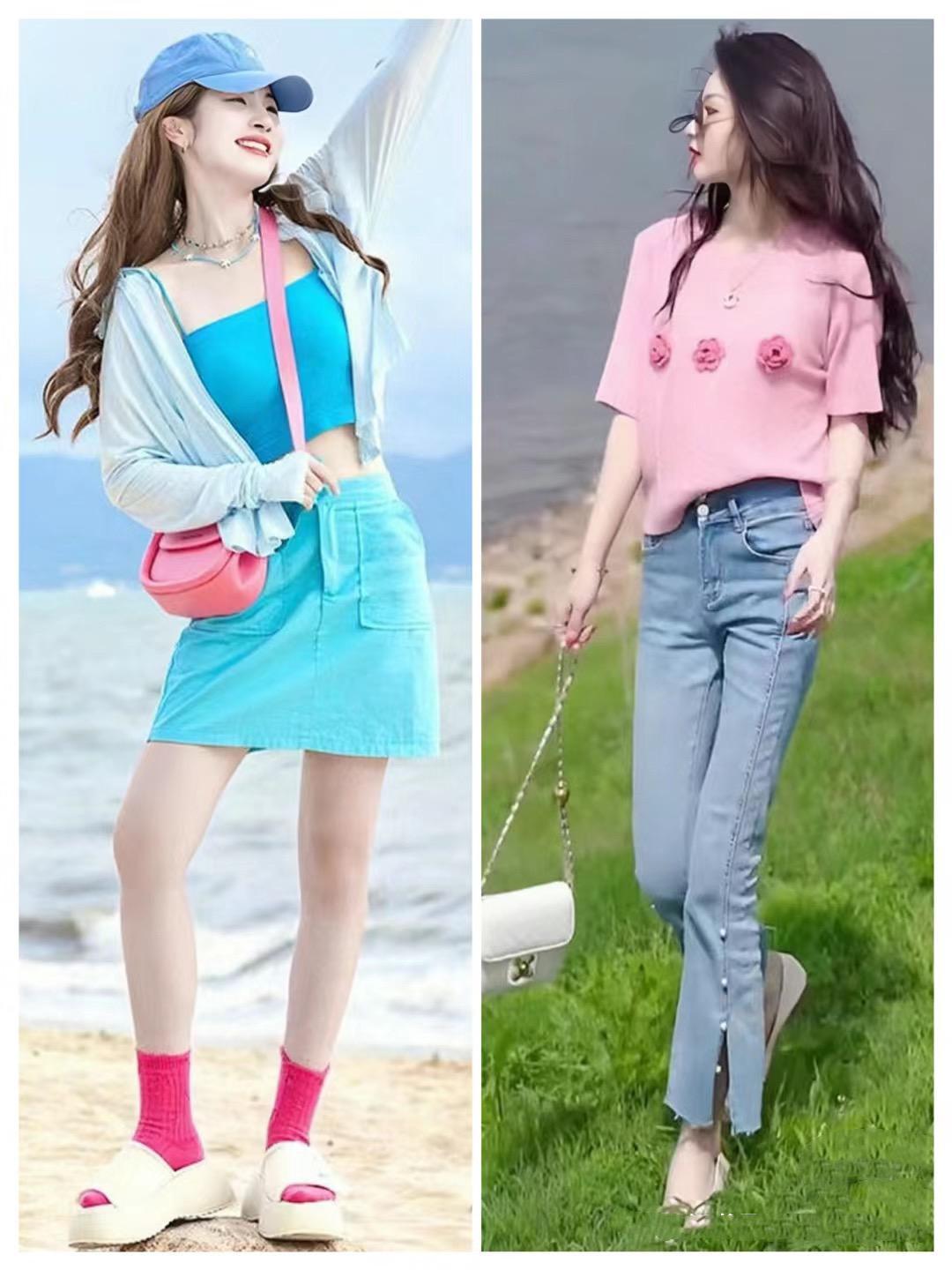如果屬於冷白皮的人羣,也可以大面積的運用藍色系。比如藍色吊帶背心、藍色半身裙、藍色防曬衫,搭配粉色襪子、包包,就格外的青春甜美。尤其是藍色吊帶背心,清爽又顯白。
