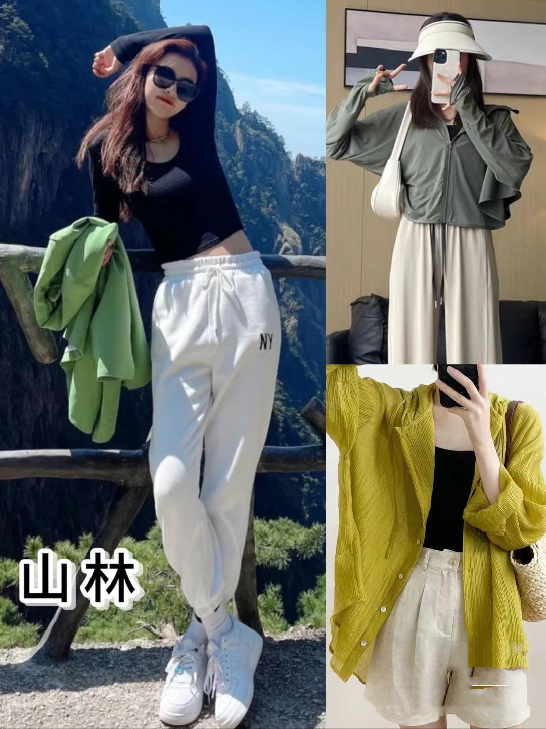 如果要去到大山裏,那麼山系穿搭就是不可少的。穿越山林,背景一般是藍綠灰,這時候我們可以選擇更鮮豔的顏色。