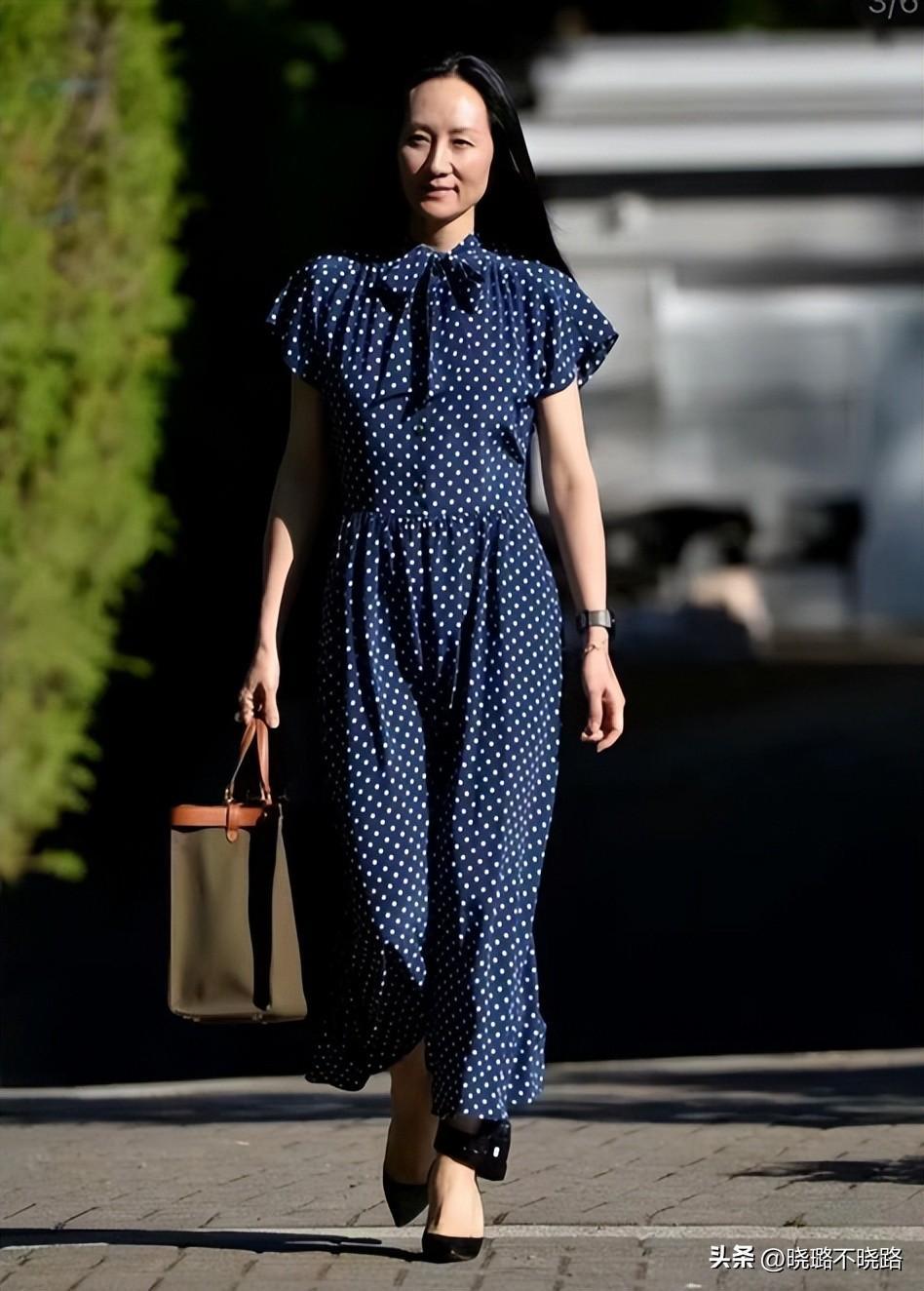 穿好連衣裙不僅在連衣裙上,還有連衣裙的搭配,特別是鞋子的配飾,建議不要穿平底鞋款式,它不能拉長女人腿部的線條,還穿不出中年女人的大氣場,配高跟鞋更爲合適。孟晚舟尖頭高跟鞋的設計,走路大氣顯腿長。