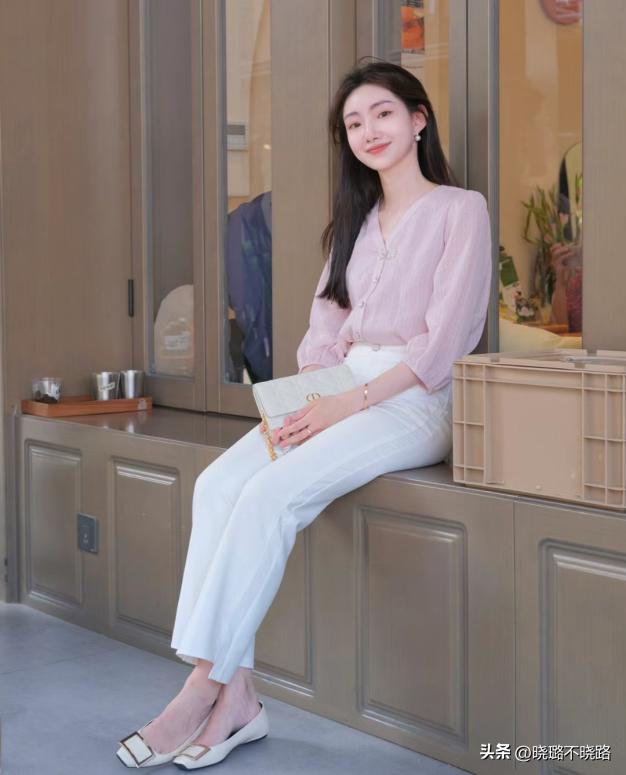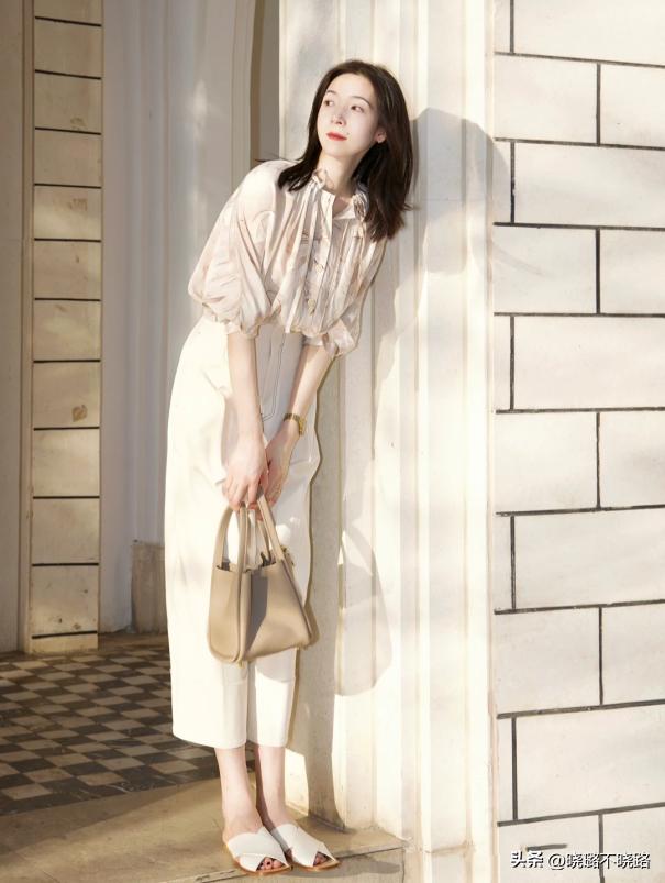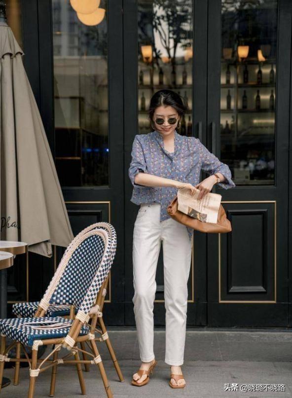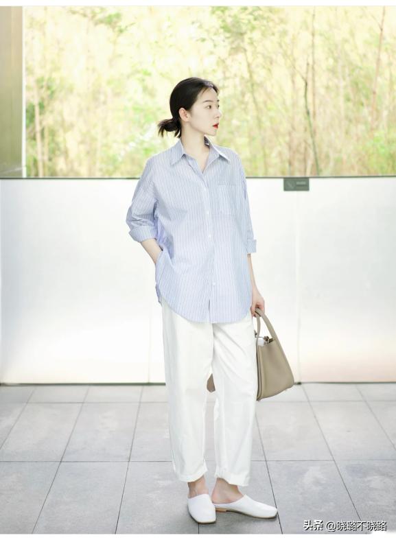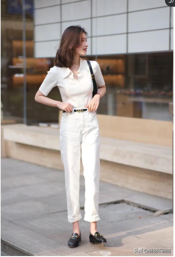 同色系的搭配簡約而又清爽,尤其是大面積的運用白色,能夠使膚色更顯白皙。白色的上衣搭配錐形褲能夠讓整體身材看起來更加苗條修長,同時優化整體比例,突顯纖細的小腿線條。而腳上的樂福鞋有助於平衡整體的身材比例,又增加了色彩的對比,讓整體會更有層次感。