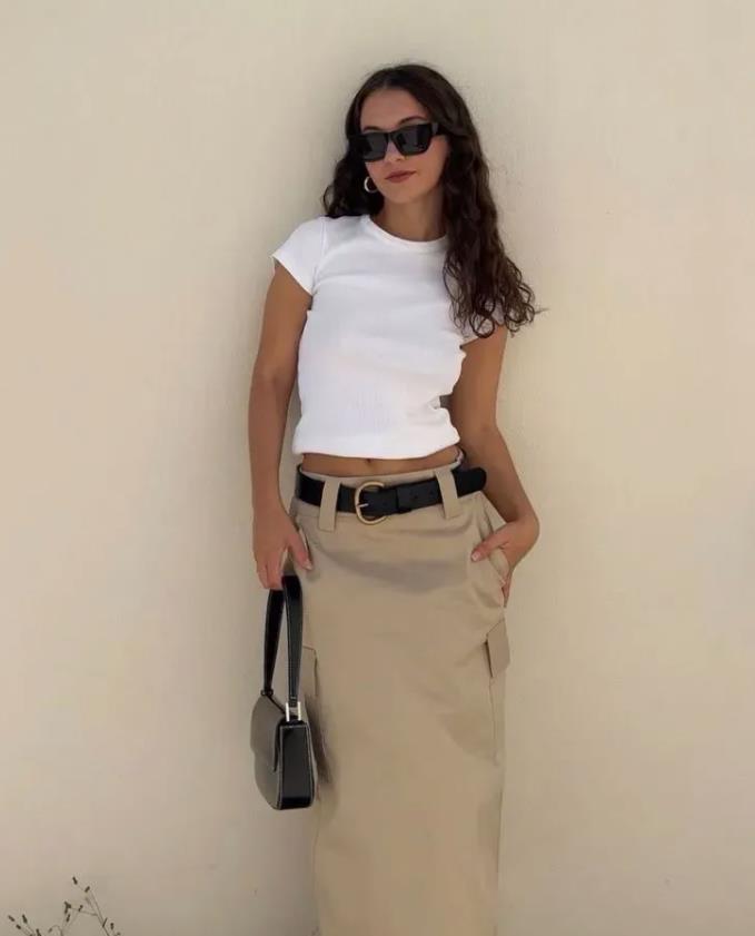 如果你希望你的白色t帶給你一些獨特的個性,不妨試着爲自己選擇一條別緻的半裙,就拿工裝風的半裙來說,白色的t搭配工裝半裙,爲簡約的造型增添了一份不羈的魅力。