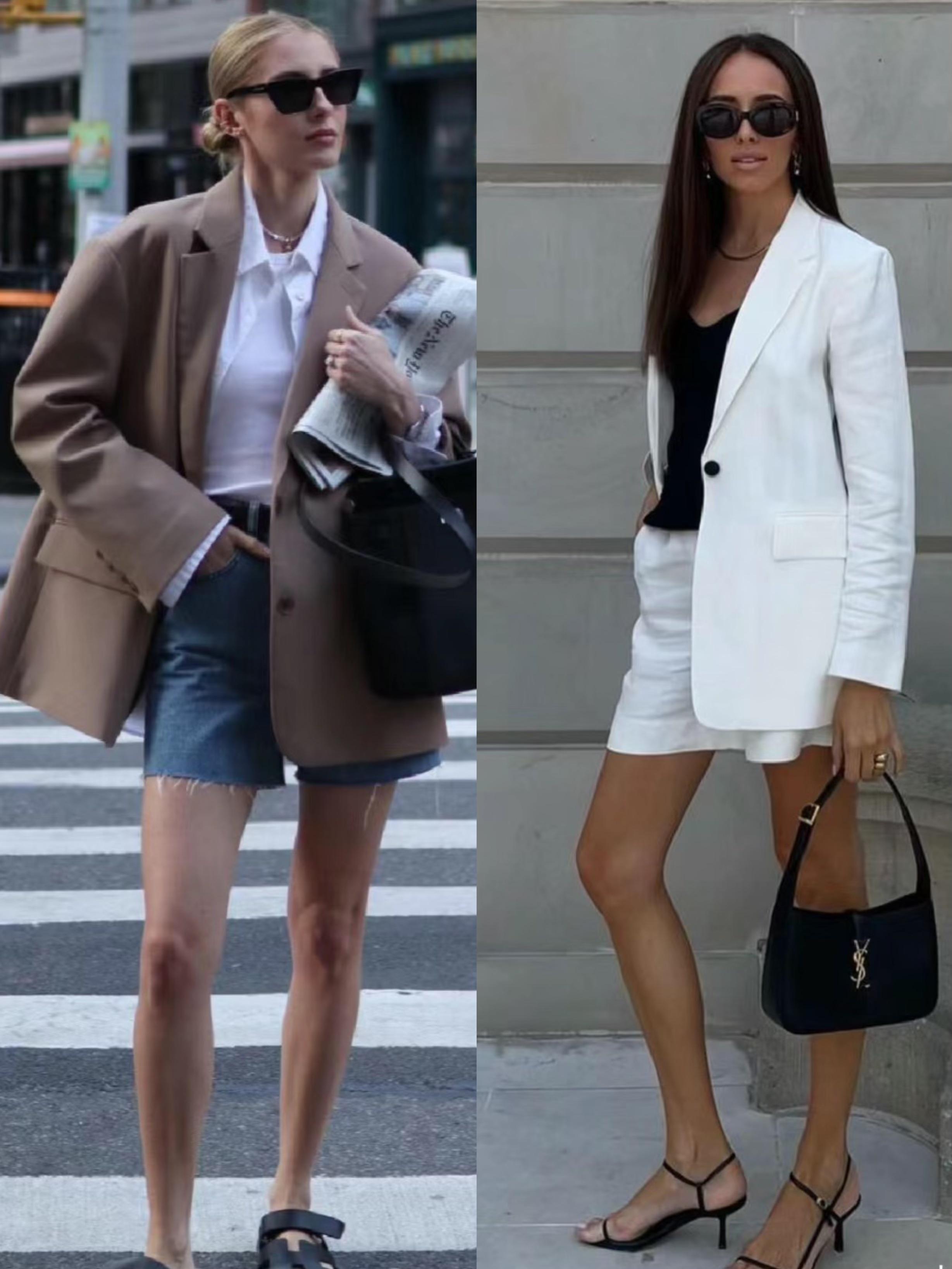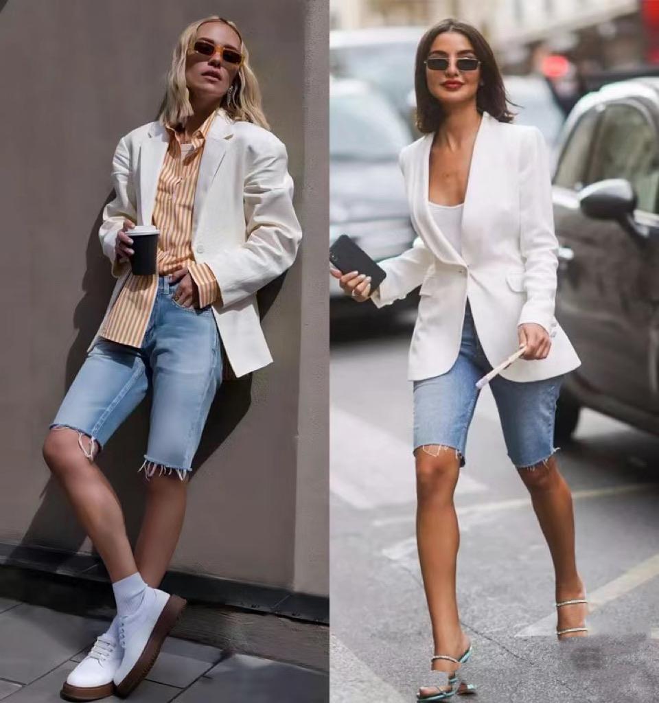 西服外套+牛仔短褲,是一種更偏向中性風格的搭配。如果想要凸顯女性氣質,西服外套儘量選擇白色系、或者其他淺色系。